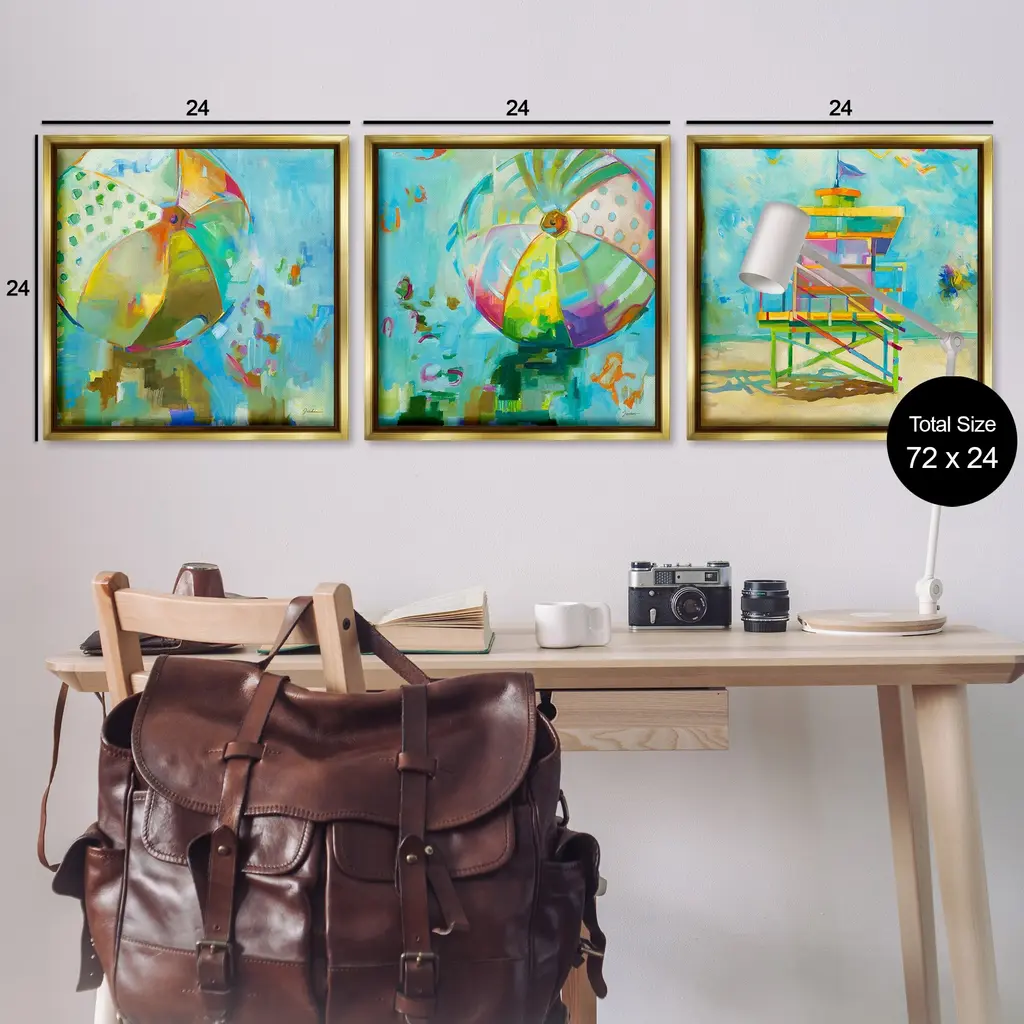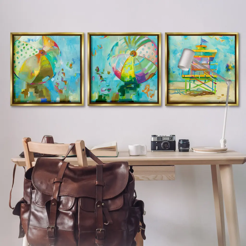 Elevate your home or office to the next level with Stupell Framed Floating Canvas Wall Art. Our premium hand-stretched canvas is mounted securely into a sturdy lightweight frame. The museum-style gap between the wrapped canvas and the box frame gives the illusion of floating artwork. Stupell Wall Art is made in the USA.Features: Dimensions: 3 Piece Set, Each Frame is 18 x 1.7 x 18Three Piece Floating Frame Canvas Products are available as 18"x18" or 25"x25" Panels. All Floating Frame Canvas Products have a 1.7" Depth.Wall Art is Ready to Hang with Hardware Free Hanging. No Installation required. For Easy Set Up Lean or Layer Artwork on Shelf or Against Wall. Artwork is Permently Fixed into the Frame.Our elevated 1.7" Thick Floating Frame is the perfect complement to our canvas style Wall Art. We use only the highest quality inks in house with industry leading printing solutions. Canvas is hand stretched over a durable wood foundation and then mounted securly into a Modern Box Frame. Made in the USA.Artwork Relates To: Modern, Painting, Abstract, Beach, Pattern, Summer, Landscape, Beach BallDesign by Liz Jardine
