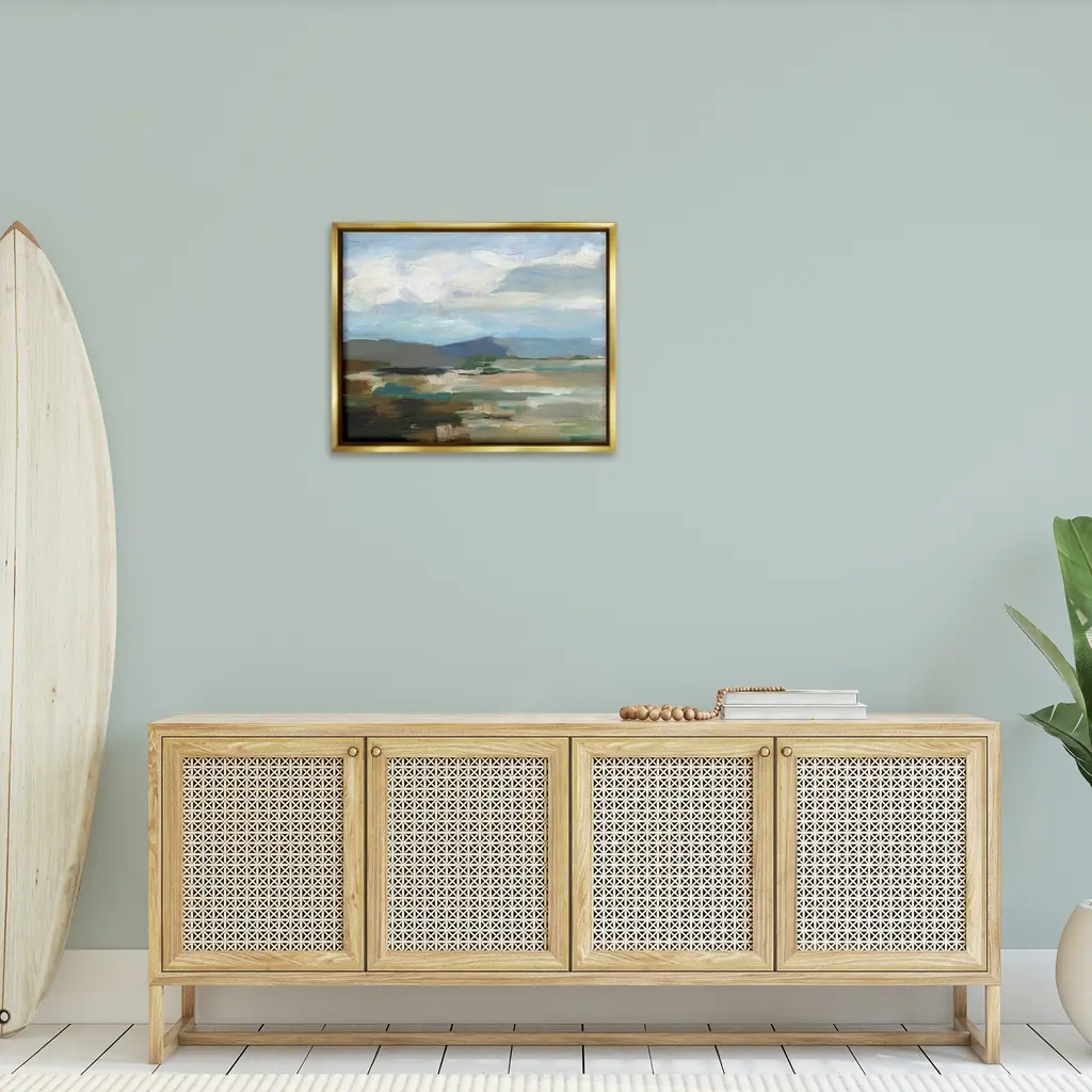 Elevate your home or office to the next level with Stupell Framed Floating Canvas Wall Art. Our premium hand-stretched canvas is mounted securely into a sturdy lightweight frame. The museum-style gap between the wrapped canvas and the box frame gives the illusion of floating artwork. Stupell Wall Art is made in the USA.Features: Dimensions: 21 x 1.7 x 17 Frame, 20 x 1.5 x 16 Canvas ArtFloating Frame Canvas Products are available in sizes 21"x17" and 31"x25". All Floating Frame Canvas Products have a 1.7" Depth.Wall Art is Ready to Hang with Hardware Free Hanging. No Installation required. For Easy Set Up Lean or Layer Artwork on Shelf or Against Wall. Artwork is Permently Fixed into the Frame.Our elevated 1.7" Thick Floating Frame is the perfect complement to our canvas style Wall Art. We use only the highest quality inks in house with industry leading printing solutions. Canvas is hand stretched over a durable wood foundation and then mounted securly into a Modern Box Frame. Made in the USA.Artwork Relates To: Painting, Nature, Water, Abstract, Landscape, Modern, Traditional, Beach, Cloud, Shore, MountainDesign by Ethan Harper