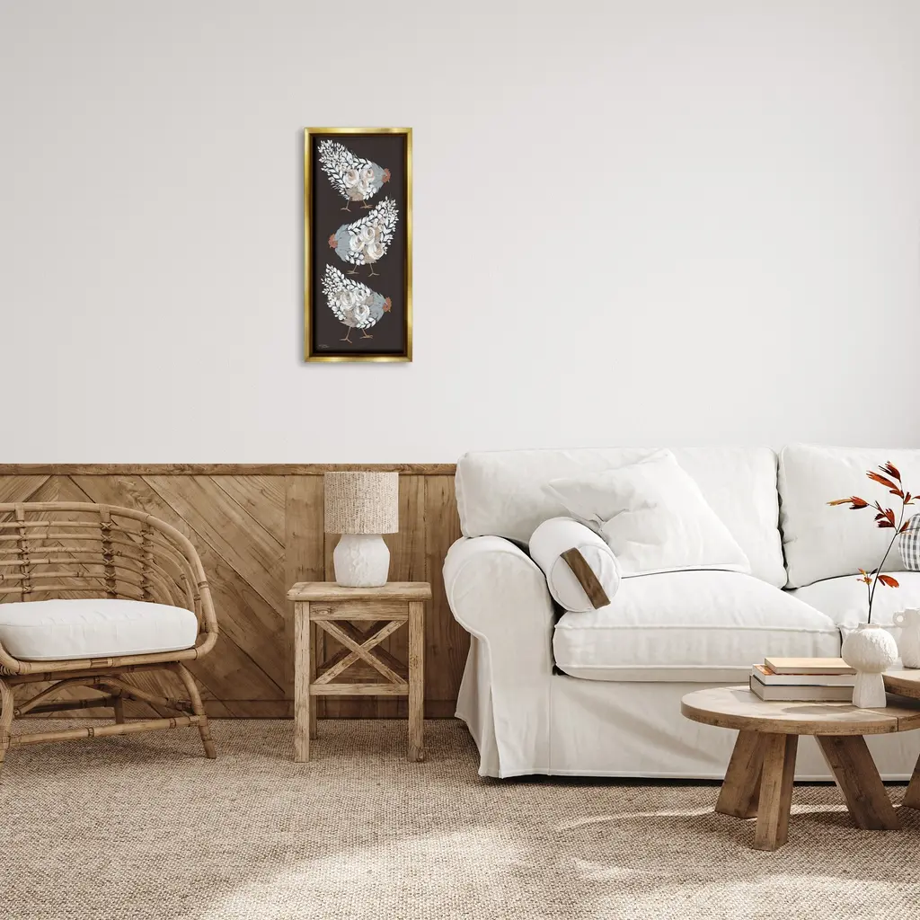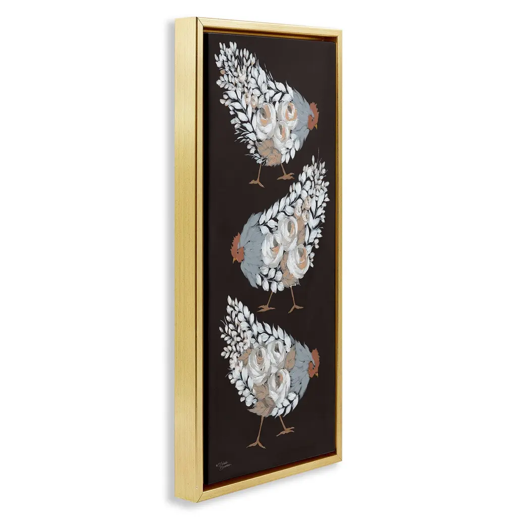 Elevate your home or office to the next level with Stupell Framed Floating Canvas Wall Art. Our premium hand-stretched canvas is mounted securely into a sturdy lightweight frame. The museum-style gap between the wrapped canvas and the box frame gives the illusion of floating artwork. Stupell Wall Art is made in the USA.Features: Dimensions: 11 x 1.7 x 25 Frame, 10 x 1.5 x 24 Canvas ArtFloating Frame Canvas Products are available in sizes 11"x25" and 14"x31". All Floating Frame Canvas Products have a 1.7" Depth.Wall Art is Ready to Hang with Hardware Free Hanging. No Installation required. For Easy Set Up Lean or Layer Artwork on Shelf or Against Wall. Artwork is Permently Fixed into the Frame.Our elevated 1.7" Thick Floating Frame is the perfect complement to our canvas style Wall Art. We use only the highest quality inks in house with industry leading printing solutions. Canvas is hand stretched over a durable wood foundation and then mounted securly into a Modern Box Frame. Made in the USA.Artwork Relates To: Floral, Pattern, Flower, Blossom, Bird, Chicken, Hen, CountryDesign by Michele Norman