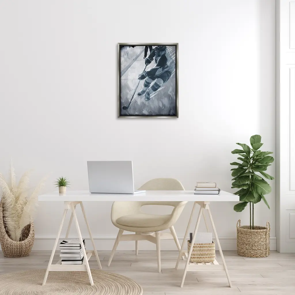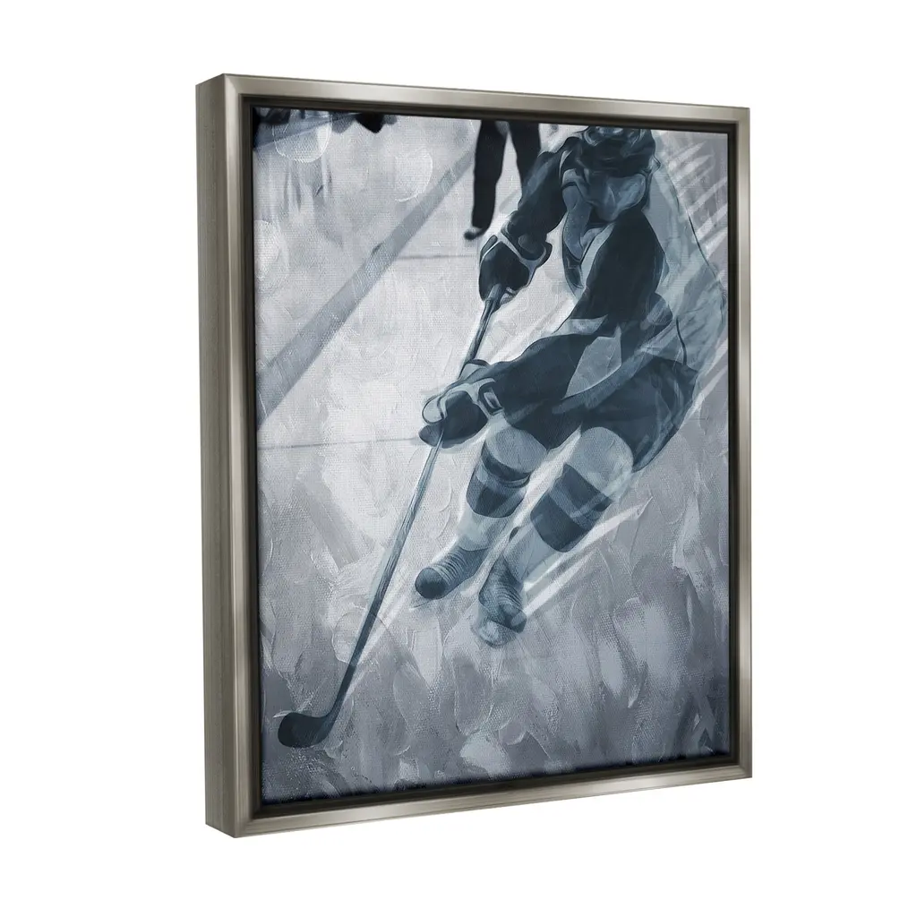 Elevate your home or office to the next level with Stupell Framed Floating Canvas Wall Art. Our premium hand-stretched canvas is mounted securely into a sturdy lightweight frame. The museum-style gap between the wrapped canvas and the box frame gives the illusion of floating artwork. Stupell Wall Art is made in the USA.Features: Dimensions: 17 x 1.7 x 21 Frame, 16 x 1.5 x 20 Canvas ArtFloating Frame Canvas Products are available in sizes 17"x21" and 25"x31". All Floating Frame Canvas Products have a 1.7" Depth.Wall Art is Ready to Hang with Hardware Free Hanging. No Installation required. For Easy Set Up Lean or Layer Artwork on Shelf or Against Wall. Artwork is Permently Fixed into the Frame.Our elevated 1.7" Thick Floating Frame is the perfect complement to our canvas style Wall Art. We use only the highest quality inks in house with industry leading printing solutions. Canvas is hand stretched over a durable wood foundation and then mounted securly into a Modern Box Frame. Made in the USA.Artwork Relates To: Hockey, Ice Hockey, Rink, Skating, Sport, Hockey Stick, Hockey Puck, Abstract, MonochromeDesign by Milli Villa