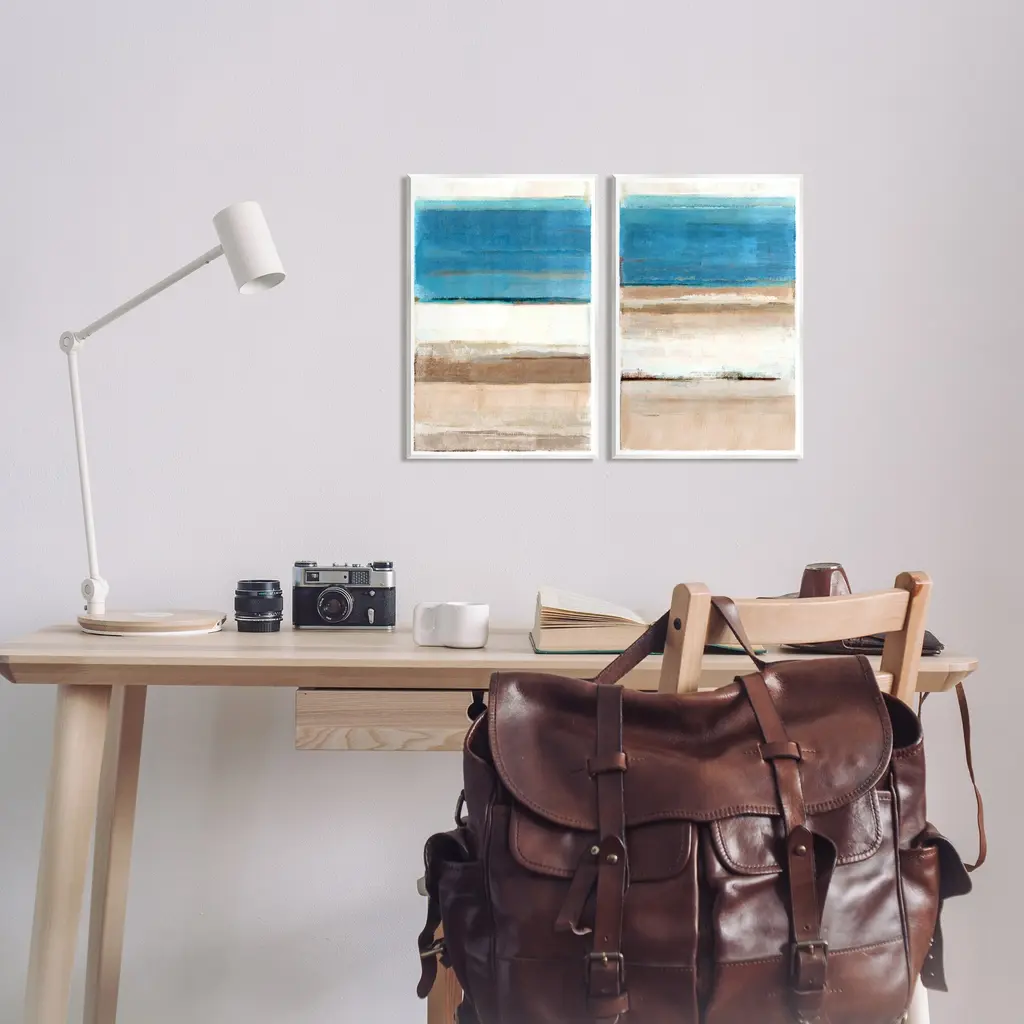 Fill any space with Stupell Wall Art Sets. Our wall plaques start as high-quality lithograph prints mounted on durable 0.5-inch thick MDF wood. Each piece is hand finished and comes with a fresh layer of white foil on the sides to give it a crisp, clean look. Plaques arrive ready to hang without installation and come with removable plastic corners to keep them from damage in transit. Stupell Industries Wall Art is made in the USA.Features: Dimensions: 2 Piece Set, Each Panel is 10 x 0.5 x 15 InchesWall Plaque Set Sizes Include Standard: 2pc, Each is 10 x 0.5 x 15 Oversized: 2pc, Each is 13 x 0.5 x 19Wall Art is Ready to Hang with Hardware Free Hanging. No installation required. For Easy Set Up Lean or Layer Artwork on Shelf or Against Wall.All of our wall plaques start off as high quality lithograph prints that are then mounted on durable 0.5 inch thick MDF wood. Each piece is hand finished and comes with a fresh layer of foil on the sides to give it a crisp clean look. Made In USA.Artwork Relates To: Painting, Modern, Abstract, Blue, BrownDesign by Flora Kouta