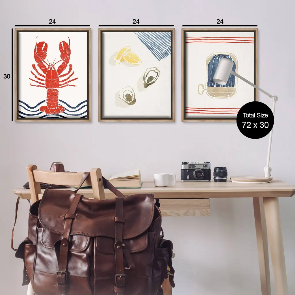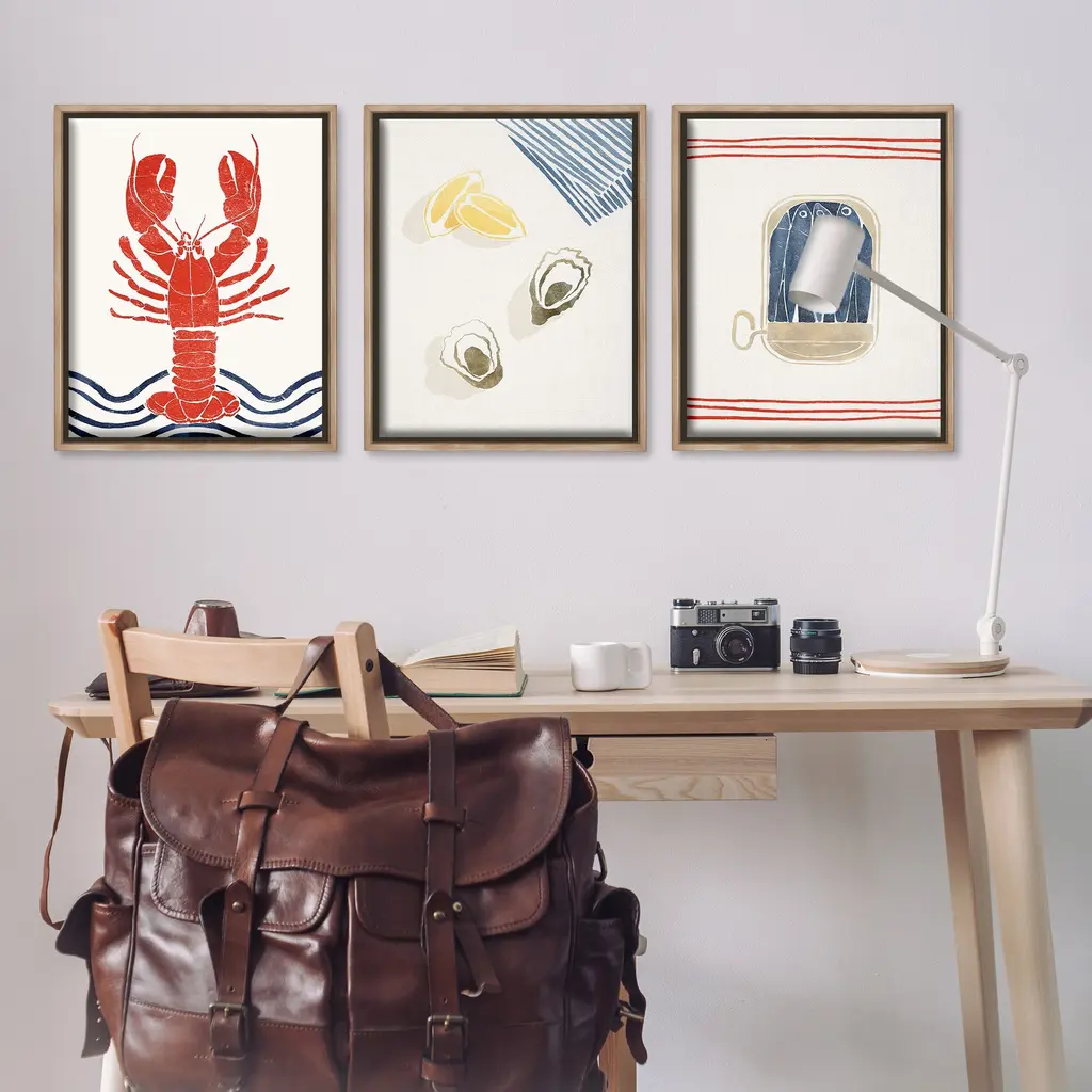Elevate your home or office to the next level with Stupell Framed Floating Canvas Wall Art. Our premium hand-stretched canvas is mounted securely into a sturdy lightweight frame. The museum-style gap between the wrapped canvas and the box frame gives the illusion of floating artwork. Stupell Wall Art is made in the USA.Features: Dimensions: 3 Piece Set, Each Frame is 17 x 1.7 x 21Three Piece Floater Framed Canvas are available as 17x21 or 25x31 Panels. All Floater Frame Products have a 1.7" Depth.Wall Art is Ready to Hang with Hardware Free Hanging. No Installation required. For Easy Set Up Lean or Layer Artwork on Shelf or Against Wall. Artwork is Permently Fixed into the Frame.Our elevated 1.7" Thick Floating Frame is the perfect complement to our canvas style Wall Art. We use only the highest quality inks in house with industry leading printing solutions. Canvas is hand stretched over a durable wood foundation and then mounted securly into a Modern Box Frame. Made in the USA.Artwork Relates To: Seafood, Animal, Invertebrate, Lobster, Sea Life, Water, Ocean, Sea, Wave, Abstract, OysterDesign by Yuyu Pont