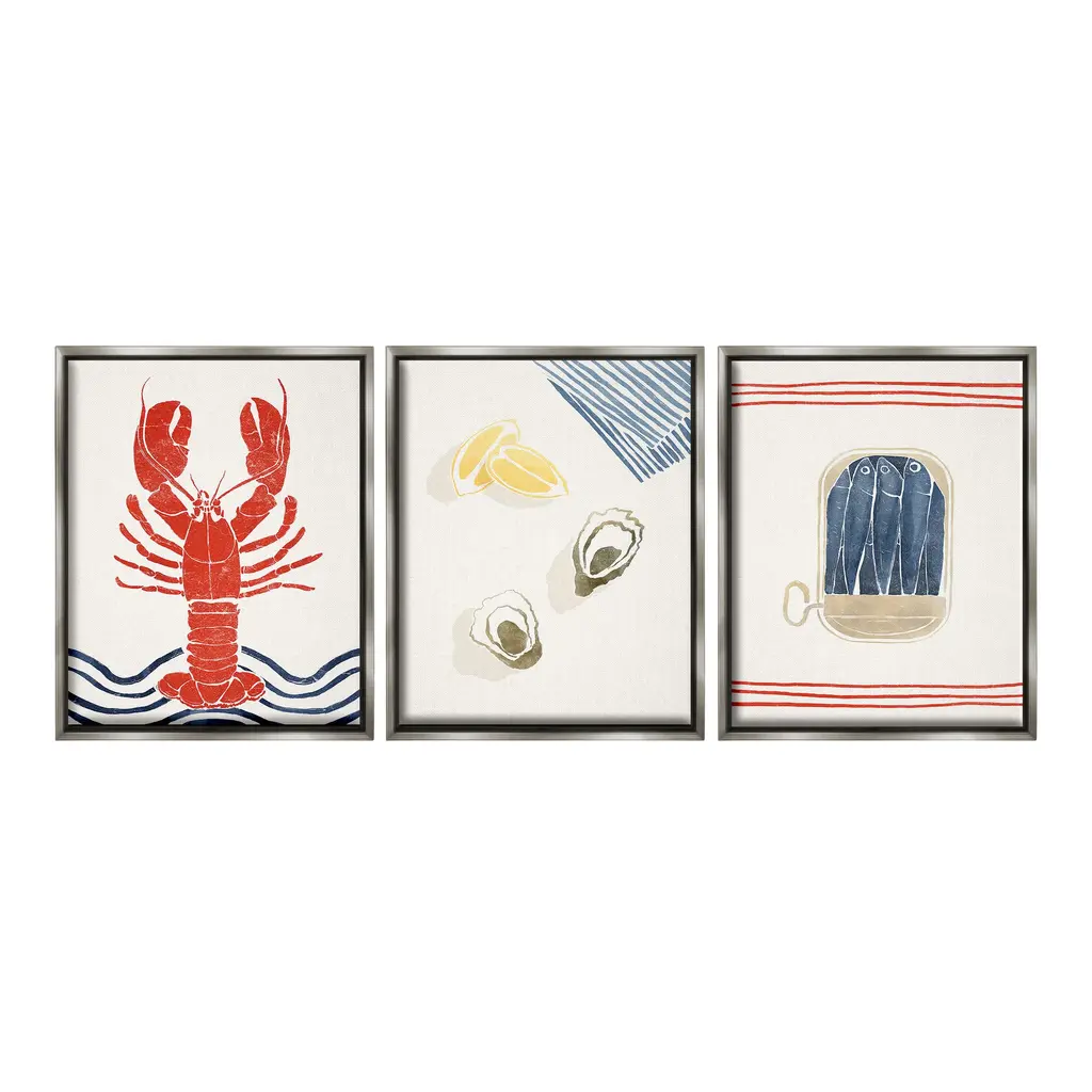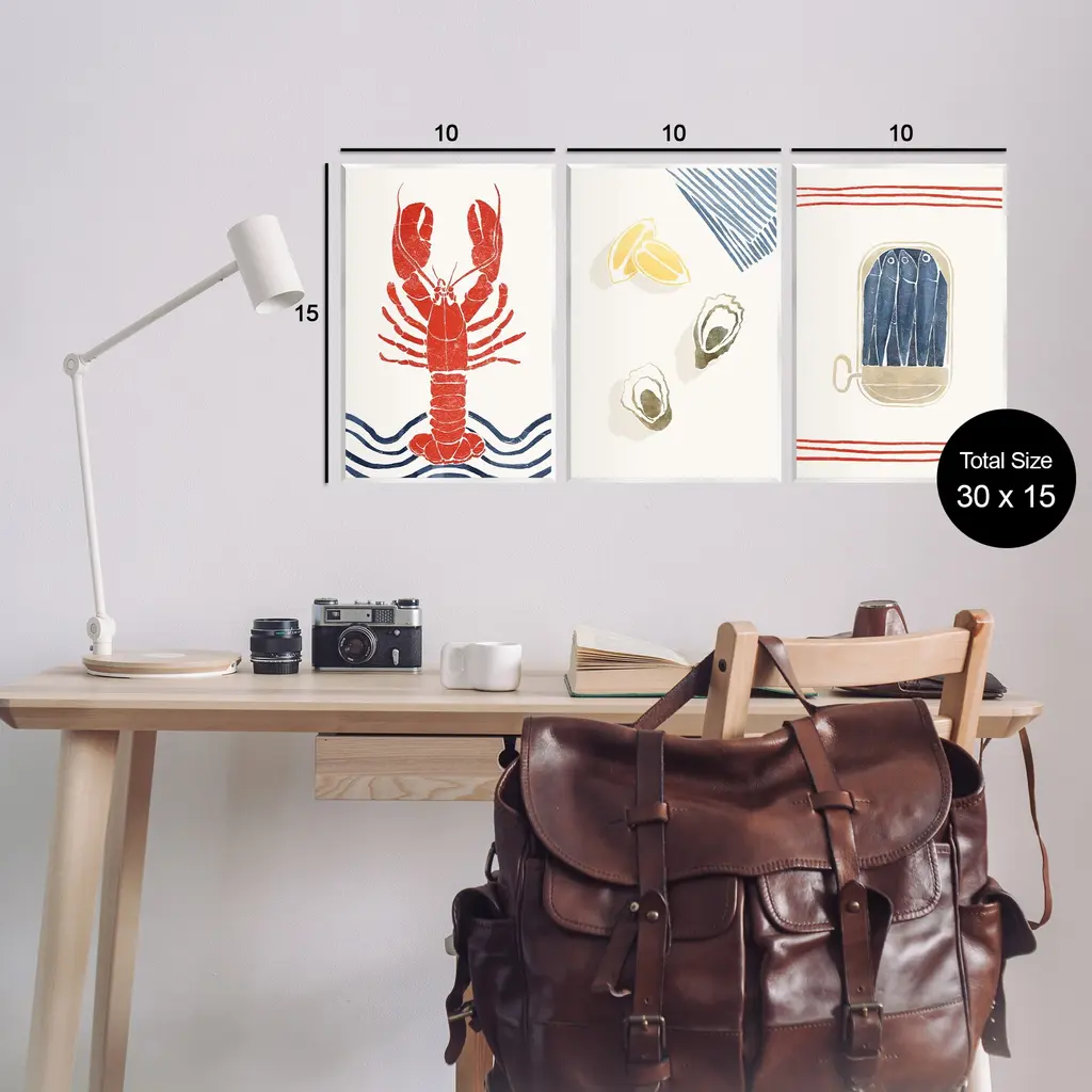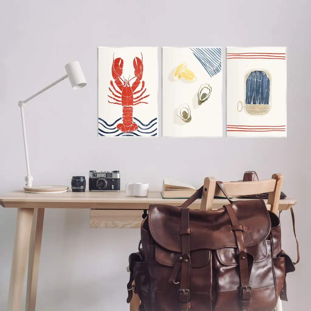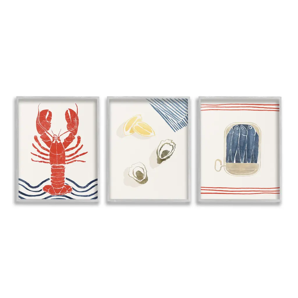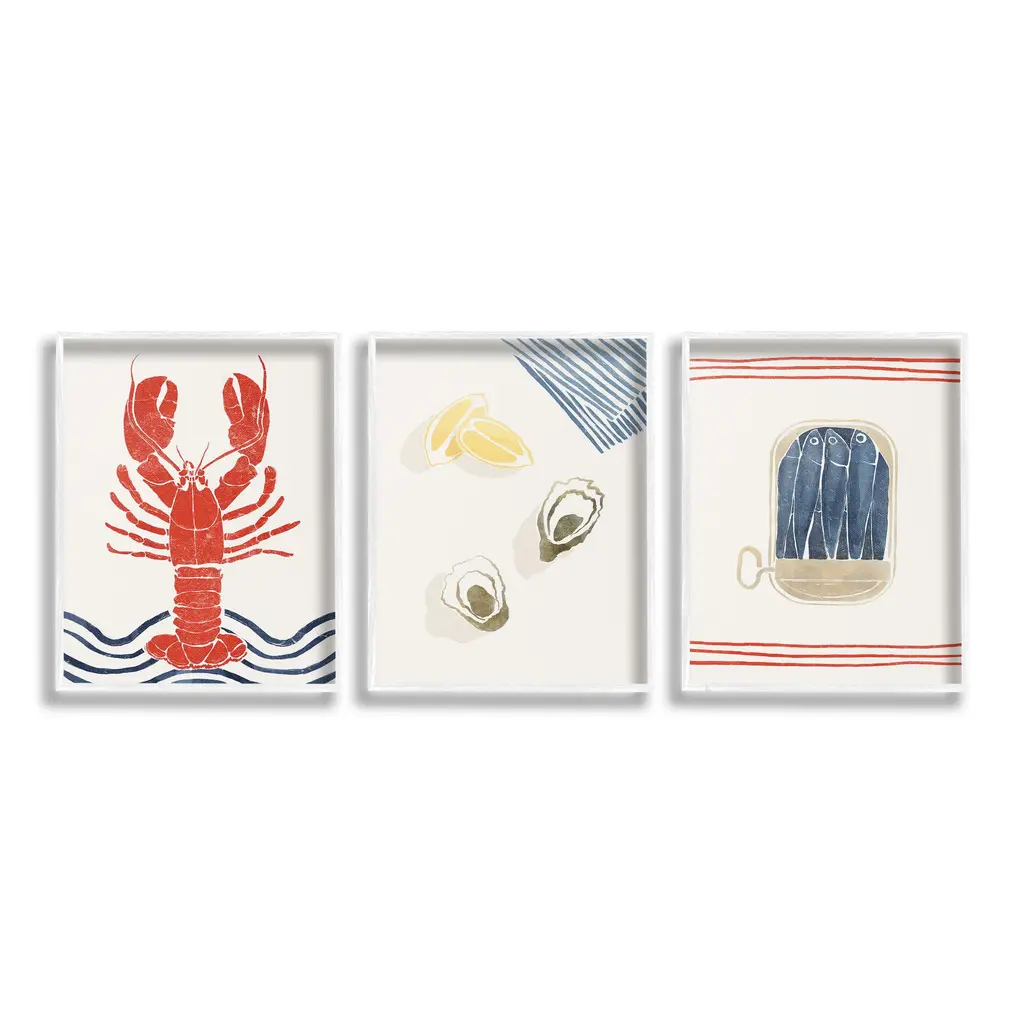 Fill any space with Stupell Wall Art Sets. Our wall plaques start as high-quality lithograph prints mounted on durable 0.5-inch thick MDF wood. Each piece is hand finished and comes with a fresh layer of white foil on the sides to give it a crisp, clean look. Plaques arrive ready to hang without installation and come with removable plastic corners to keep them from damage in transit. Stupell Wall Art is made in the USA.Features: Dimensions: 3 Piece Set, Each Panel is 10 x 0.5 x 15 InchesThree Piece Wall Plaque Sets are available as 10"x15" or 13"x19" Panels. All Wall Plaque Panels have a 0.5" Depth.Wall Art is Ready to Hang with Hardware Free Hanging. No installation required. For Easy Set Up Lean or Layer Artwork on Shelf or Against Wall.All of our wall plaques start off as high quality lithograph prints that are then mounted on durable 0.5 inch thick MDF wood. Each piece is hand finished and comes with a fresh layer of foil on the sides to give it a crisp clean look. Made In USA.Artwork Relates To: Seafood, Animal, Invertebrate, Lobster, Sea Life, Water, Ocean, Sea, Wave, Abstract, OysterDesign by Yuyu Pont