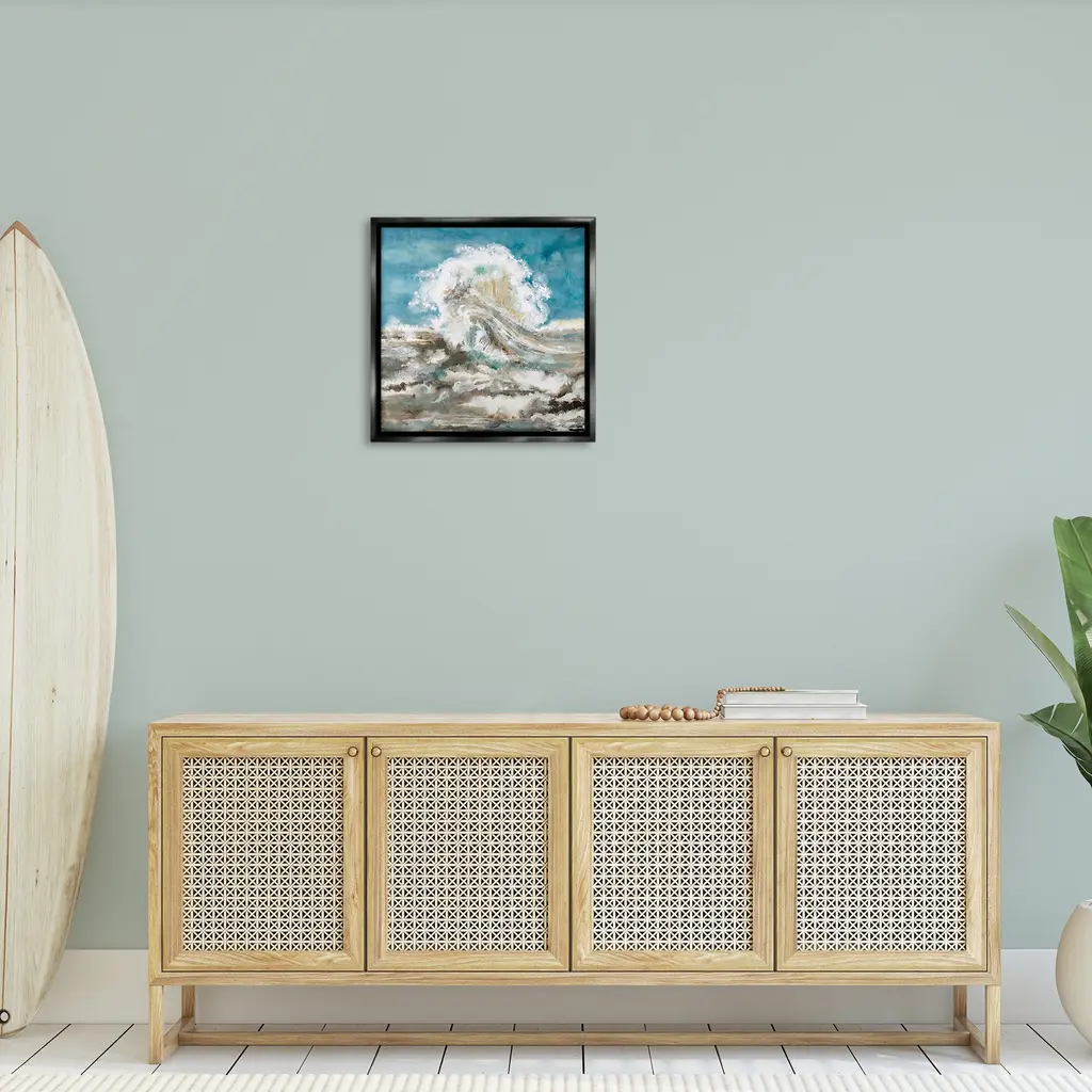 Elevate your home or office to the next level with Stupell Framed Floating Canvas Wall Art. Our premium hand-stretched canvas is mounted securely into a sturdy lightweight frame. The museum-style gap between the wrapped canvas and the box frame gives the illusion of floating artwork. Stupell Wall Art is made in the USA.Features: Dimensions: 18 x 1.7 x 18 Frame, 17 x 1.5 x 17 Canvas ArtFloating Frame Canvas Products are available in sizes 18"x18" and 25"x25". All Floating Frame Canvas Products have a 1.7" Depth.Wall Art is Ready to Hang with Hardware Free Hanging. No Installation required. For Easy Set Up Lean or Layer Artwork on Shelf or Against Wall. Artwork is Permently Fixed into the Frame.Our elevated 1.7" Thick Floating Frame is the perfect complement to our canvas style Wall Art. We use only the highest quality inks in house with industry leading printing solutions. Canvas is hand stretched over a durable wood foundation and then mounted securly into a Modern Box Frame. Made in the USA.Artwork Relates To: Abstract, Modern, Beach, Ocean, Sea, Nautical, WaveDesign by Liz Jardine