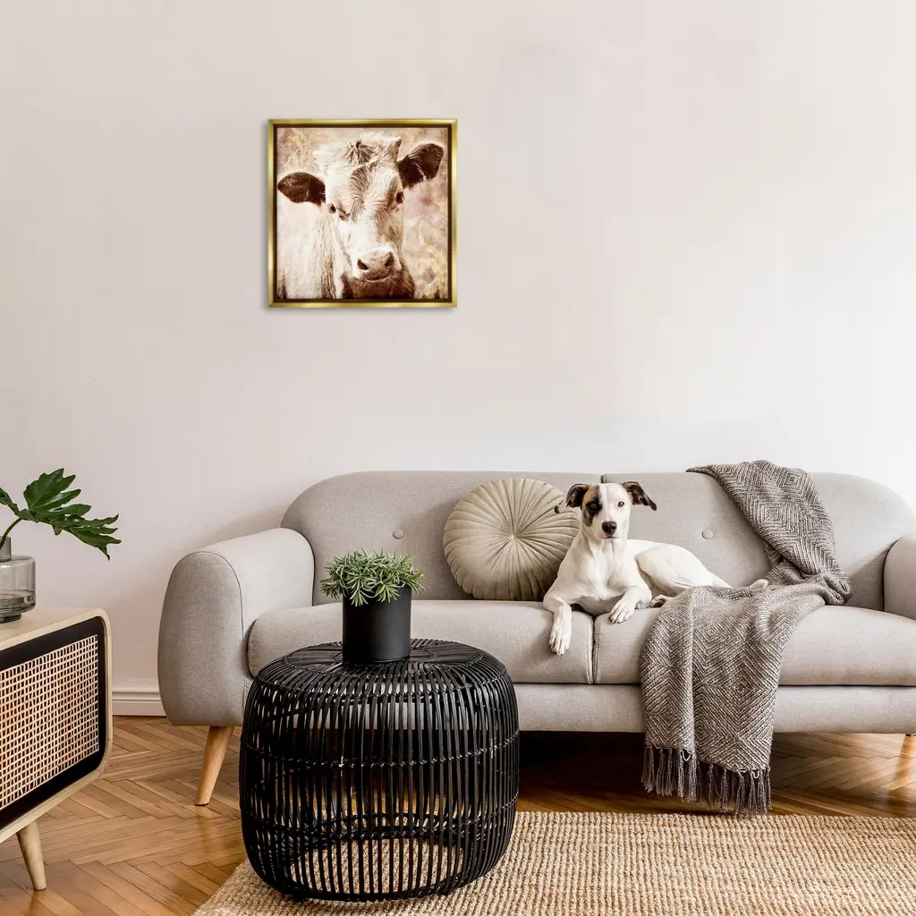 Elevate your home or office to the next level with Stupell Framed Floating Canvas Wall Art. Our premium hand-stretched canvas is mounted securely into a sturdy lightweight frame. The museum-style gap between the wrapped canvas and the box frame gives the illusion of floating artwork. Stupell Wall Art is made in the USA.Features: Dimensions: 18 x 1.7 x 18 Frame, 17 x 1.5 x 17 Canvas ArtFloating Frame Canvas Products are available in sizes 18"x18" and 25"x25". All Floating Frame Canvas Products have a 1.7" Depth.Wall Art is Ready to Hang with Hardware Free Hanging. No Installation required. For Easy Set Up Lean or Layer Artwork on Shelf or Against Wall. Artwork is Permently Fixed into the Frame.Our elevated 1.7" Thick Floating Frame is the perfect complement to our canvas style Wall Art. We use only the highest quality inks in house with industry leading printing solutions. Canvas is hand stretched over a durable wood foundation and then mounted securly into a Modern Box Frame. Made in the USA.Artwork Relates To: Animal, Cattle, Cow, Mammal, Calf, Farm, CountryDesign by GraffiTee Studios