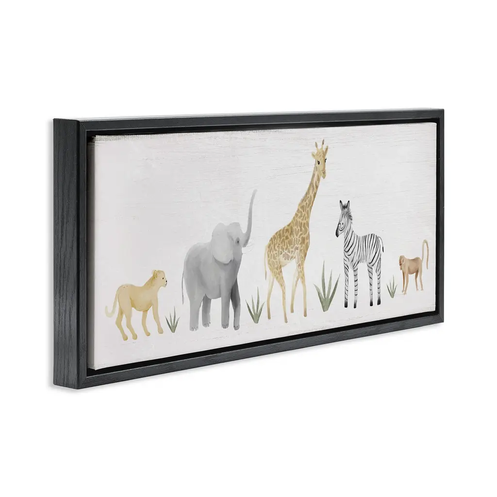 Elevate your home or office to the next level with Stupell Framed Floating Canvas Wall Art. Our premium hand-stretched canvas is mounted securely into a sturdy lightweight frame. The museum-style gap between the wrapped canvas and the box frame gives the illusion of floating artwork. Stupell Wall Art is made in the USA.Features: Dimensions: 25 x 1.7 x 11 Frame, 24 x 1.5 x 10 Canvas ArtFloating Frame Canvas Products are available in sizes 25"x11" and 31"x14". All Floating Frame Canvas Products have a 1.7" Depth.Wall Art is Ready to Hang with Hardware Free Hanging. No Installation required. For Easy Set Up Lean or Layer Artwork on Shelf or Against Wall. Artwork is Permently Fixed into the Frame.Our elevated 1.7" Thick Floating Frame is the perfect complement to our canvas style Wall Art. We use only the highest quality inks in house with industry leading printing solutions. Canvas is hand stretched over a durable wood foundation and then mounted securly into a Modern Box Frame. Made in the USA.Artwork Relates To: Kid's, Zoo animals, Zebra, giraffe, elephant, monkey, AnimalDesign by Daphne Polselli