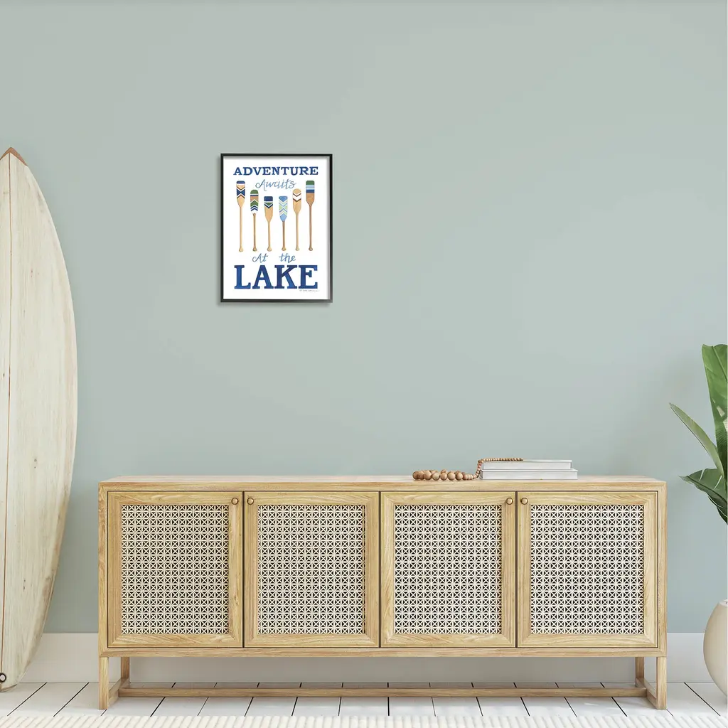 Our Framed Giclee Wall Art adds a touch of class to any space in your home or office. Frames are available in three alluring styles: black, gray farmhouse and white. Our textured artwork will add more depth and dimension to any space. Each piece is mounted with a 1.5 inch thick wood grain frame that is ready to hang! Looking for a statement piece? We have oversized artwork available.Features: Dimensions: 11 x 1.5 x 14 FramedFramed Giclee Sizes Include Standard: 11 x 1.5 x 14 Large: 16 x 1.5 x 20 Oversized: 24 x 1.5 x 30Wall Art is Ready to Hang - No Installation or Hardware Needed. For Easy Set Up Lean or Layer Artwork on Shelf or Against Wall.Our giclée prints are carefully mounted on a durable MDF backing, and then perfectly finished in a 1.5 inch thick woodgrain frame. Mounted frame colors include black, gray farmhouse and white. Made In USA.Artwork Relates To: Lake, Water, Scenery, Summer, Kayak, Boat, Tree, OarsDesign by Deb StrainLiving Room, Den, Hallway, Office, Entryway, Study, Dining Room or Bed Room.Text Includes: Adventure Awaits At The Lake