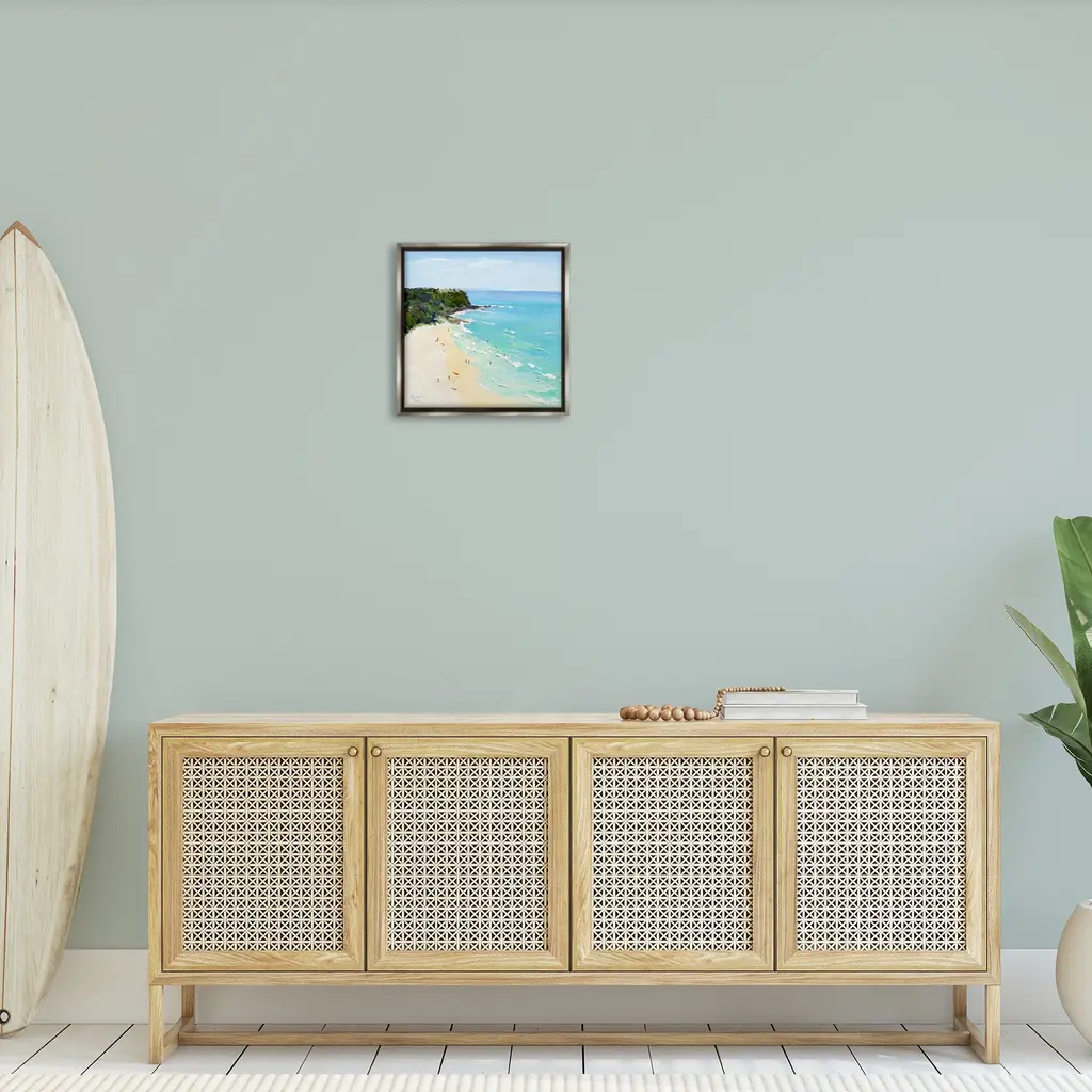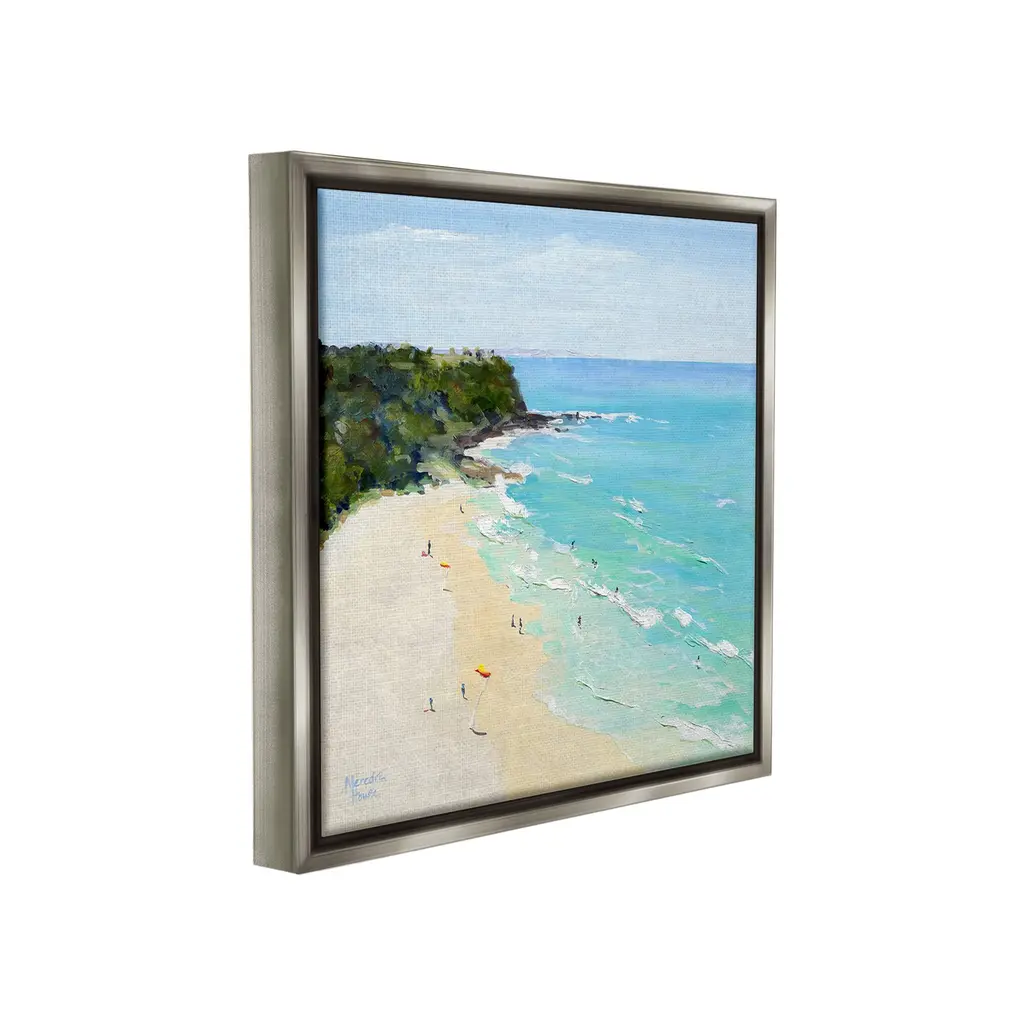 Elevate your home or office to the next level with Stupell Framed Floating Canvas Wall Art. Our premium hand-stretched canvas is mounted securely into a sturdy lightweight frame. The museum-style gap between the wrapped canvas and the box frame gives the illusion of floating artwork. Stupell Wall Art is made in the USA.Features: Dimensions: 18 x 1.7 x 18 Frame, 17 x 1.5 x 17 Canvas ArtFloating Frame Canvas Products are available in sizes 18"x18" and 25"x25". All Floating Frame Canvas Products have a 1.7" Depth.Wall Art is Ready to Hang with Hardware Free Hanging. No Installation required. For Easy Set Up Lean or Layer Artwork on Shelf or Against Wall. Artwork is Permently Fixed into the Frame.Our elevated 1.7" Thick Floating Frame is the perfect complement to our canvas style Wall Art. We use only the highest quality inks in house with industry leading printing solutions. Canvas is hand stretched over a durable wood foundation and then mounted securly into a Modern Box Frame. Made in the USA.Artwork Relates To: Beach, Coast, Sea, Shoreline, Nautical, Shore, People, Beachgoers, LandscapeDesign by Meredith Howse