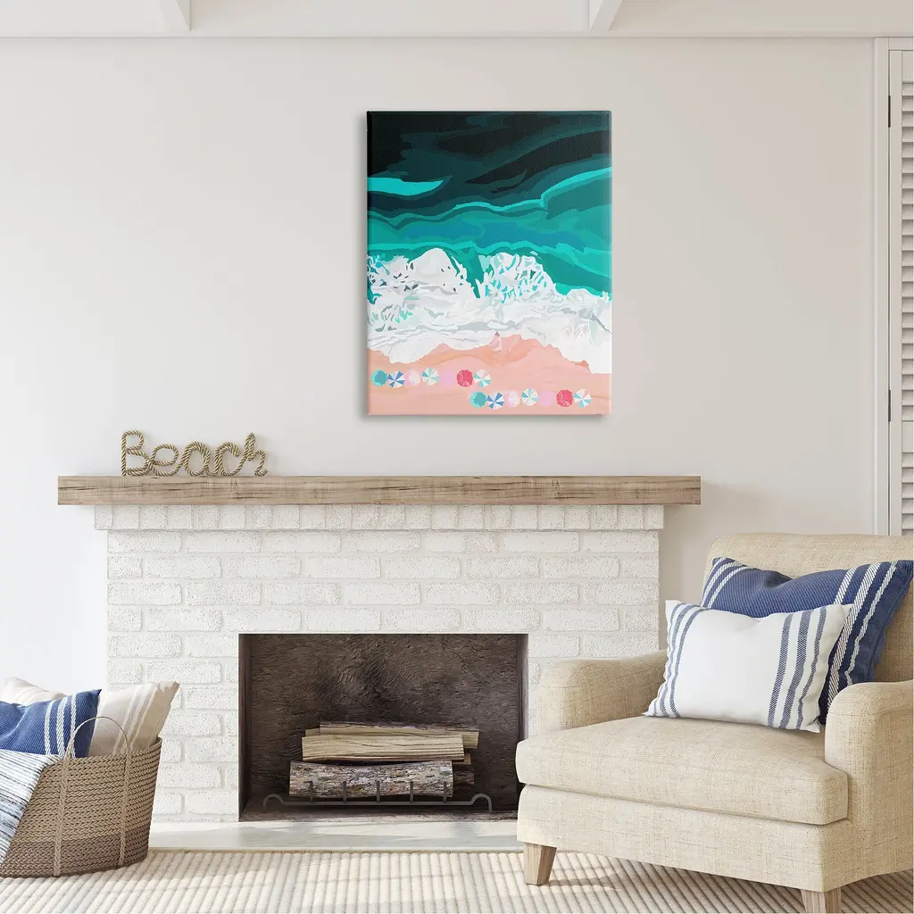 We create our stretched canvas to the highest standards. Using only the highest quality inks and canvas on Mimaki printers, we hand-cut and stretch each piece over a 1.5-inch thick wooden frame for hanging. As a result, the art comes ready to hang on the sturdy ledge with no installation required. Stupell Wall Art is made in the USA.Features: Dimensions: 16 x 1.5 x 20 InchesStretched Canvas Sizes Include Standard: 16 x 1.5 x 20 Large: 20 x 1.5 x 30 X-Large: 30 x 1.5 x 40 Oversized: 36 x 1.5 x 48Wall Art is Ready to Hang - No Installation or Hardware Needed. For Easy Set Up Lean or Layer Artwork on Shelf or Against Wall.Our stretched canvas is created with the highest standards. We use only the highest quality inks and canvas on our in house Mimaki printers, and then hand cut and stretch each piece over a 1.5 inch thick wooden frame for hanging. Made In USA.Artwork Relates To: Sea, Water, Shoreline, Coast, Beach, Sea Waves, Beach UmbrellaDesign by Amelia Noyes