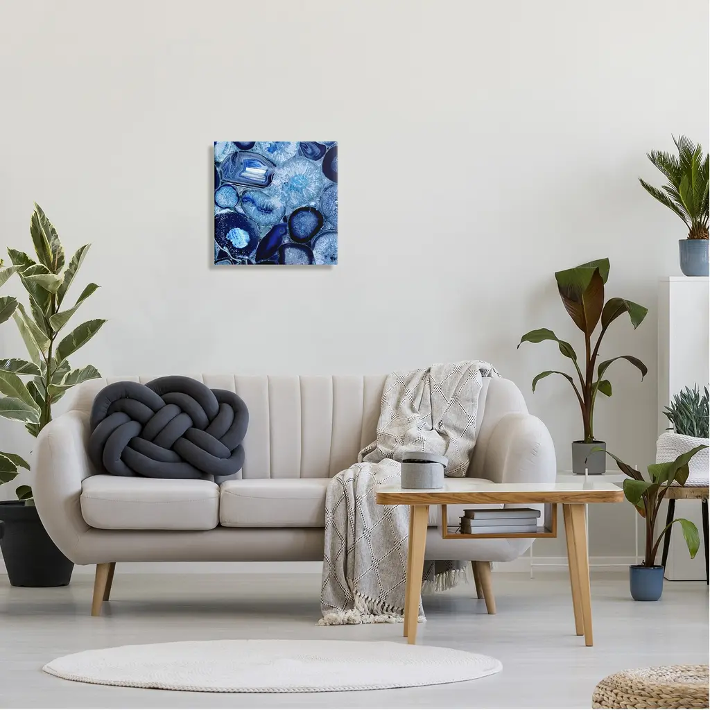 Proudly made in the USA, Our stretched canvas is created with the highest standards. We use only the highest quality inks and canvas on our in house Mimaki printers, and then hand cut and stretch each piece over a 1.5 inch thick wooden frame for hanging. The art comes ready to hang with no installation required. Room Type: Living Room, Den, Hallway, Office, Entryway, Study, Dining Room or Bedroom, Guest Room, Studio, Dorm or BoudoirFeatures: Dimensions: 17 x 1.5 x 17 InchesStretched Canvas Sizes Include Standard: 17 x 1.5 x 17 Large: 24 x 1.5 x 24 X-Large: 30 x 1.5 x 30 Oversized: 36 x 1.5 x 36Wall Art is Ready to Hang - No Installation or Hardware Needed. For Easy Set Up Lean or Layer Artwork on Shelf or Against Wall.Our stretched canvas is created with the highest standards. We use only the highest quality inks and canvas on our in house Mimaki printers, and then hand cut and stretch each piece over a 1.5 inch thick wooden frame for hanging. Made In USA.Artwork Relates To: Crystal, Mineral, Geode, Rock, Nature, Modern, BlueDesign by Danielle Carson