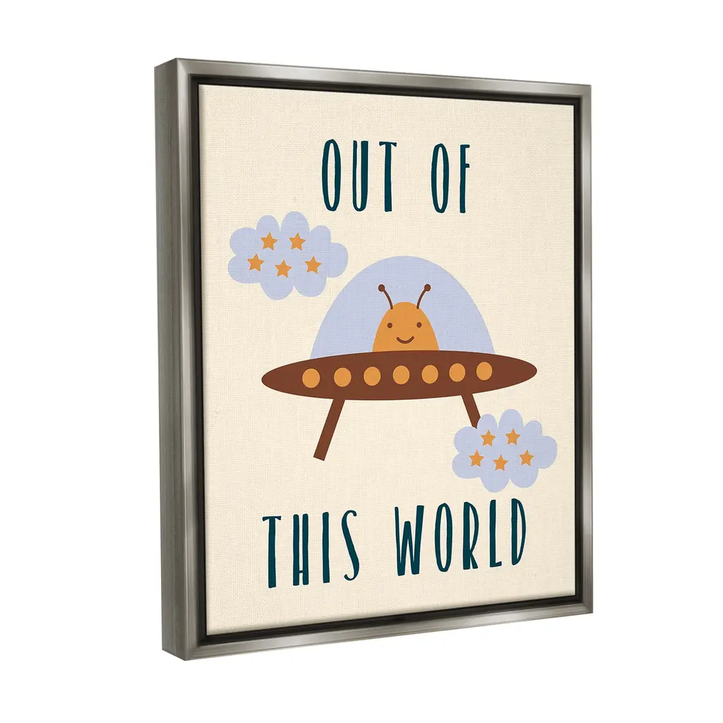Elevate your home or office to the next level with Stupell Framed Floating Canvas Wall Art. Our premium hand-stretched canvas is mounted securely into a sturdy lightweight frame. The museum-style gap between the wrapped canvas and the box frame gives the illusion of floating artwork. Stupell Wall Art is made in the USA.Features: Dimensions: 17 x 1.7 x 21 Frame, 16 x 1.5 x 20 Canvas ArtFloating Frame Canvas Products are available in sizes 17"x21" and 25"x31". All Floating Frame Canvas Products have a 1.7" Depth.Wall Art is Ready to Hang with Hardware Free Hanging. No Installation required. For Easy Set Up Lean or Layer Artwork on Shelf or Against Wall. Artwork is Permently Fixed into the Frame.Our elevated 1.7" Thick Floating Frame is the perfect complement to our canvas style Wall Art. We use only the highest quality inks in house with industry leading printing solutions. Canvas is hand stretched over a durable wood foundation and then mounted securly into a Modern Box Frame. Made in the USA.Artwork Relates To: Alien, Outer Space, Spaceship, UFO, Cloud, Stars, Minimal, Whimsical, Out of this WorldDesign by Lil' Rue