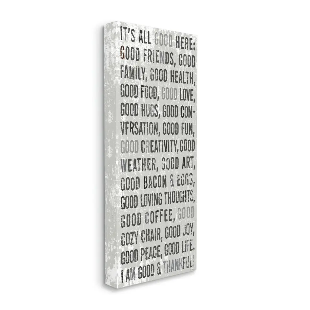 We create our stretched canvas to the highest standards. Using only the highest quality inks and canvas on Mimaki printers, we hand-cut and stretch each piece over a 1.5-inch thick wooden frame for hanging. As a result, the art comes ready to hang on the sturdy ledge with no installation required. Stupell Wall Art is made in the USA.Features: Dimensions: 10 x 1.5 x 24 InchesStretched Canvas Sizes Include Standard: 10 x 1.5 x 24 Large: 13 x 1.5 x 30 X-Large: 17 x 1.5 x 40 Oversized: 20 x 1.5 x 48Wall Art is Ready to Hang with Hardware Free Hanging. No installation required. For Easy Set Up Lean or Layer Artwork on Shelf or Against Wall.Our stretched canvas is created with the highest standards. We use only the highest quality inks and canvas on our in house Mimaki printers, and then hand cut and stretch each piece over a 1.5 inch thick wooden frame for hanging. Made In USA.Artwork Relates To: It's All Good Here, Phrase, GreyDesign by Peter Horjus
