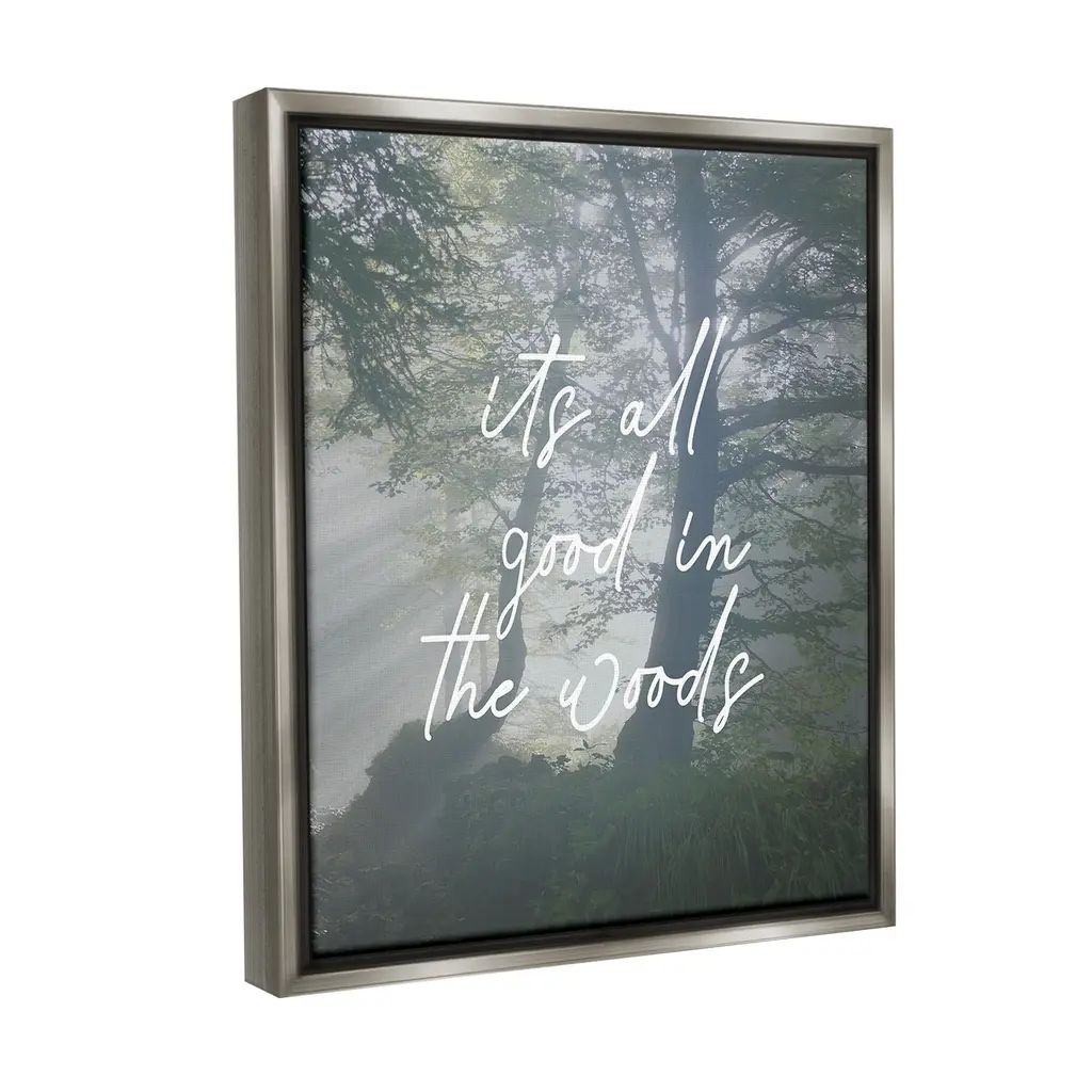 Elevate your home or office to the next level with Stupell Framed Floating Canvas Wall Art. Our premium hand-stretched canvas is mounted securely into a sturdy lightweight frame. The museum-style gap between the wrapped canvas and the box frame gives the illusion of floating artwork. Stupell Wall Art is made in the USA.Features: Dimensions: 17 x 1.7 x 21 Frame, 16 x 1.5 x 20 Canvas ArtFloating Frame Canvas Products are available in sizes 17"x21" and 25"x31". All Floating Frame Canvas Products have a 1.7" Depth.Wall Art is Ready to Hang with Hardware Free Hanging. No Installation required. For Easy Set Up Lean or Layer Artwork on Shelf or Against Wall. Artwork is Permently Fixed into the Frame.Our elevated 1.7" Thick Floating Frame is the perfect complement to our canvas style Wall Art. We use only the highest quality inks in house with industry leading printing solutions. Canvas is hand stretched over a durable wood foundation and then mounted securly into a Modern Box Frame. Made in the USA.Artwork Relates To: Plant, Vegetation, Nature, Tree, Woodland, Weather, Grove, Wilderness, Forest, Woodland, It's All Good in the WoodsDesign by Lil' Rue