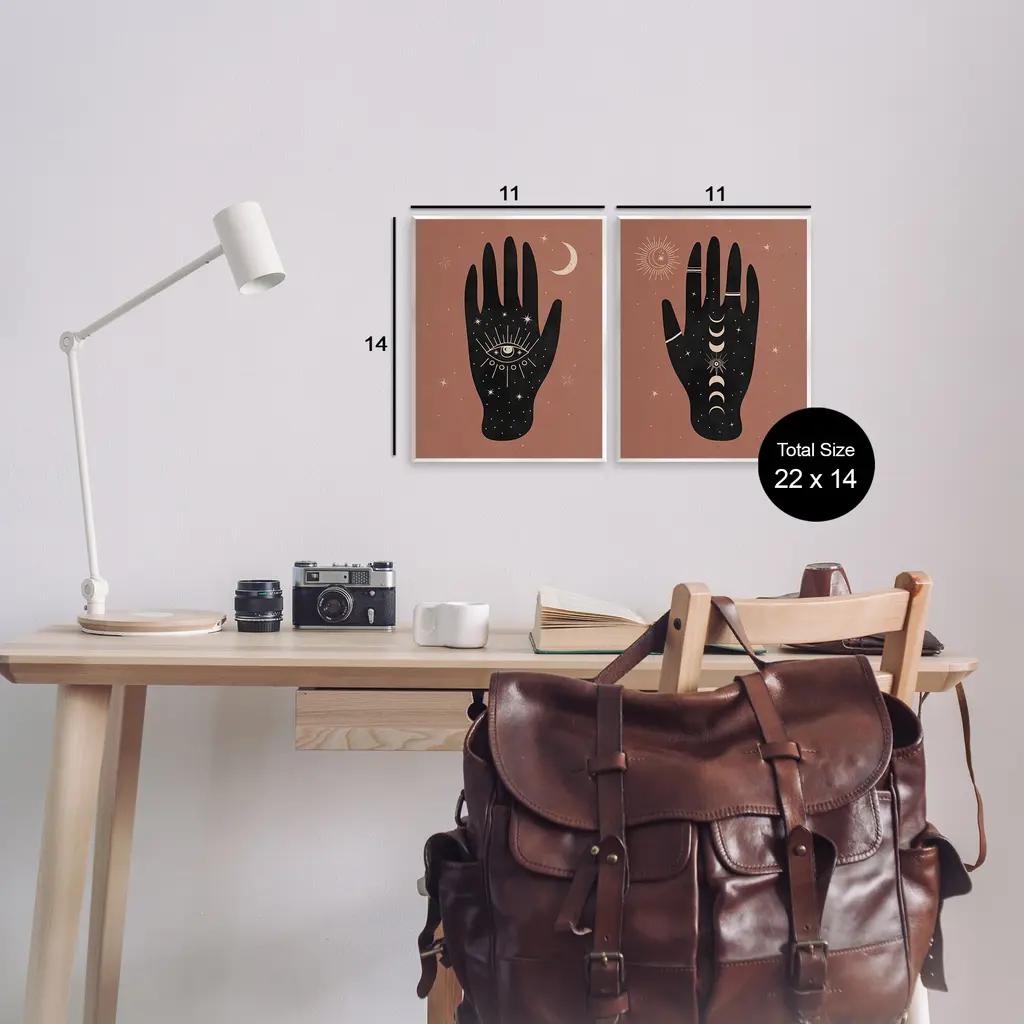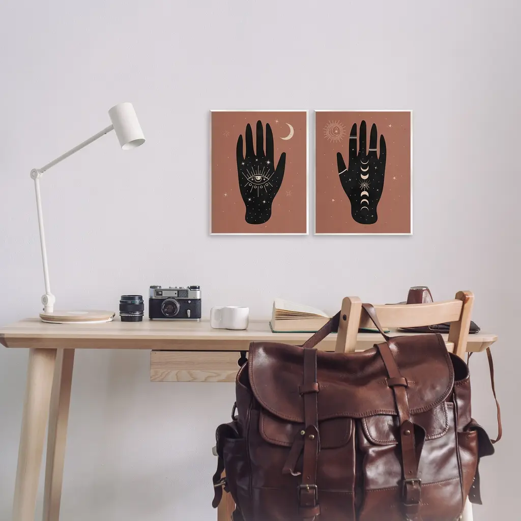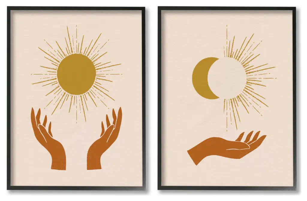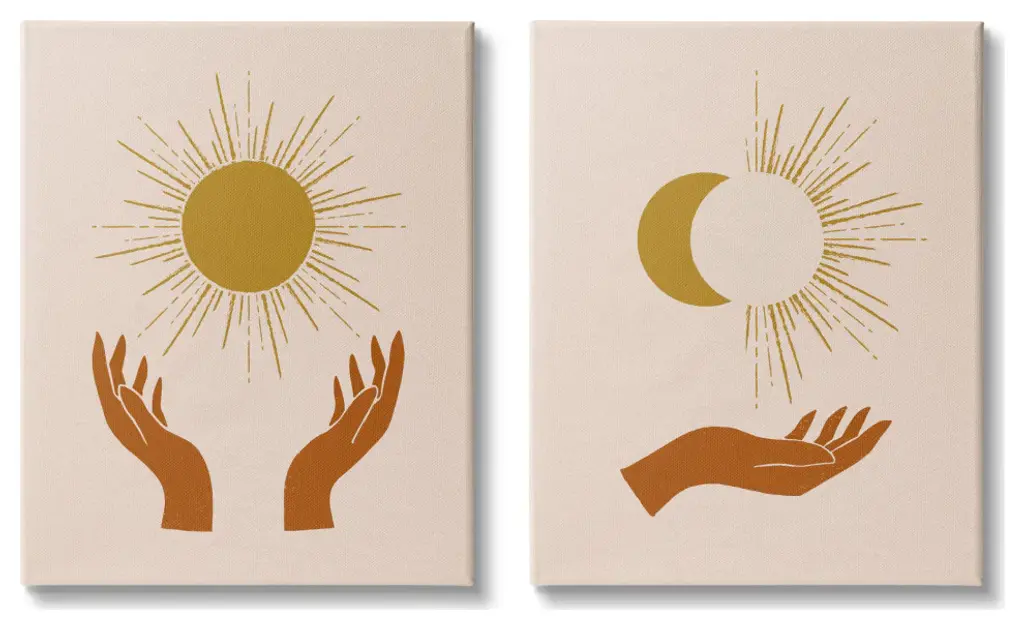 Fill any space with Stupell Wall Art Sets. Our wall plaques start as high-quality lithograph prints mounted on durable 0.5-inch thick MDF wood. Each piece is hand finished and comes with a fresh layer of white foil on the sides to give it a crisp, clean look. Plaques arrive ready to hang without installation and come with removable plastic corners to keep them from damage in transit. Stupell Wall Art is made in the USA.Features: Dimensions: 2 Piece Set, Each Panel is 11 x 0.5 x 14 InchesWall Art is Ready to Hang with Hardware Free Hanging. No installation required. For Easy Set Up Lean or Layer Artwork on Shelf or Against Wall.All of our wall plaques start off as high quality lithograph prints that are then mounted on durable 0.5 inch thick MDF wood. Each piece is hand finished and comes with a fresh layer of foil on the sides to give it a crisp clean look. Made In USA.Artwork Relates To: Astrology, Hand, Moon Phases, Person, Witchy, Spiritual, MoonDesign by Nina Blue