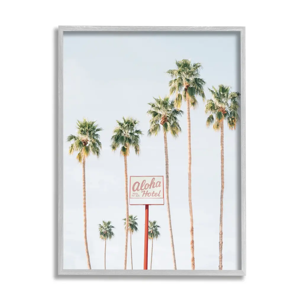 Add dimension to any room with our textured Framed Giclee Artwork. Our framed artwork is securely mounted into a 1.5-inch thick wood grain frame and ready to hang. Frames are available in three alluring styles: black, gray farmhouse and white. In addition, you should check out our oversized options if you want a statement piece. Stupell Wall Art is made in the USA.Features: Dimensions: 11 x 1.5 x 14 FramedFramed Giclee Sizes Include Standard: 11 x 1.5 x 14 Large: 16 x 1.5 x 20 Oversized: 24 x 1.5 x 30Wall Art is Ready to Hang with Hardware Free Hanging. No installation required. For Easy Set Up Lean or Layer Artwork on Shelf or Against Wall.Our giclée prints are carefully mounted on a durable MDF backing, and then perfectly finished in a 1.5 inch thick woodgrain frame. Mounted frame colors include black, gray farmhouse and white. Made In USA.Artwork Relates To: Palm Tree, Plant, Tree, Summer, Vegetation, Nature, Sign, Aloha Hotel, Tropical, VacationDesign by Sisi and Seb