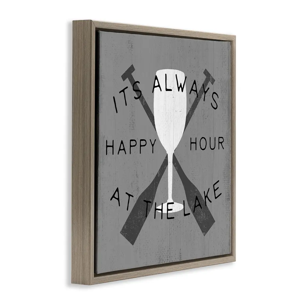 Elevate your home or office to the next level with Stupell Framed Floating Canvas Wall Art. Our premium hand-stretched canvas is mounted securely into a sturdy lightweight frame. The museum-style gap between the wrapped canvas and the box frame gives the illusion of floating artwork. Stupell Wall Art is made in the USA.Features: Dimensions: 18 x 1.7 x 18 Frame, 17 x 1.5 x 17 Canvas ArtFloating Frame Canvas Products are available in sizes 18"x18" and 25"x25". All Floating Frame Canvas Products have a 1.7" Depth.Wall Art is Ready to Hang with Hardware Free Hanging. No Installation required. For Easy Set Up Lean or Layer Artwork on Shelf or Against Wall. Artwork is Permently Fixed into the Frame.Our elevated 1.7" Thick Floating Frame is the perfect complement to our canvas style Wall Art. We use only the highest quality inks in house with industry leading printing solutions. Canvas is hand stretched over a durable wood foundation and then mounted securly into a Modern Box Frame. Made in the USA.Artwork Relates To: Lake House, Oars, Wine Glass, Wine, Happy Hour, Humor, Nautical, BoatingDesign by Daphne Polselli