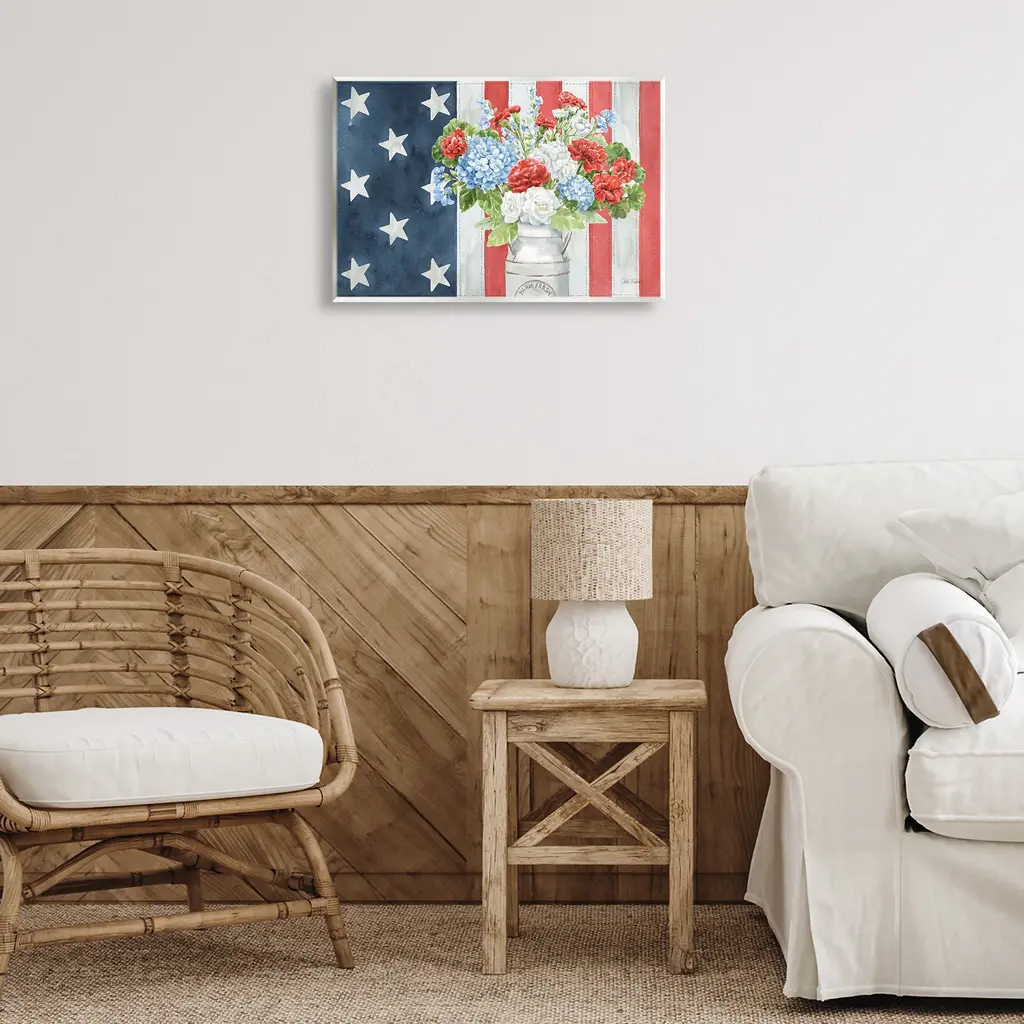 Our wall plaques start as high-quality lithograph prints mounted on durable 0.5-inch thick MDF wood. Each piece is hand finished and comes with a fresh layer of white foil on the sides to give it a crisp, clean look. Plaques arrive ready to hang without installation and come with removable plastic corners to keep them from damage in transit. Stupell Wall Art is made in the USA.Features: Dimensions: 15 x 0.5 x 10 InchesWall Plaque Product Sizes Include 15"x10" and 19"x13". All wall plaque products have a 0.5" Depth. Wall Art is Ready to Hang with Hardware Free Hanging. No installation required. For Easy Set Up Lean or Layer Artwork on Shelf or Against Wall.All of our wall plaques start off as high quality lithograph prints that are then mounted on durable 0.5 inch thick MDF wood. Each piece is hand finished and comes with a fresh layer of foil on the sides to give it a crisp clean look. Made In USA.Artwork Relates To: Americana, Patriotic, Flag, Flower, BouquetDesign by Leslie Trimbach