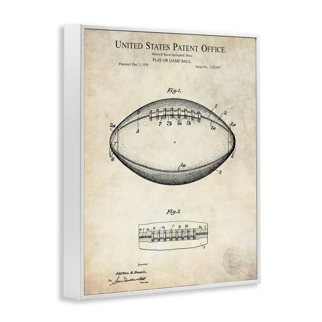 Stupell American Football Sports Patent Diagram Blueprint Design Framed Wall Art - Beige - 16 X 20 - White