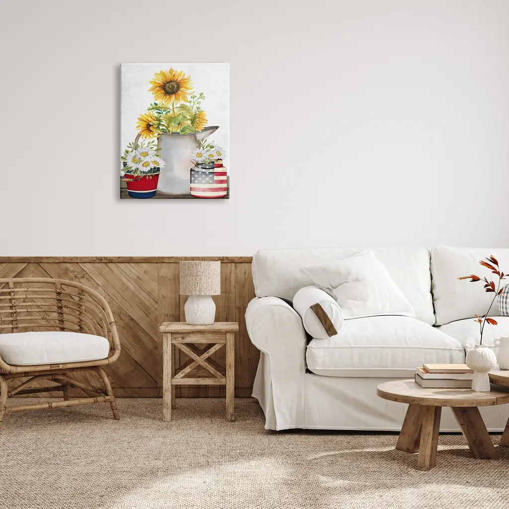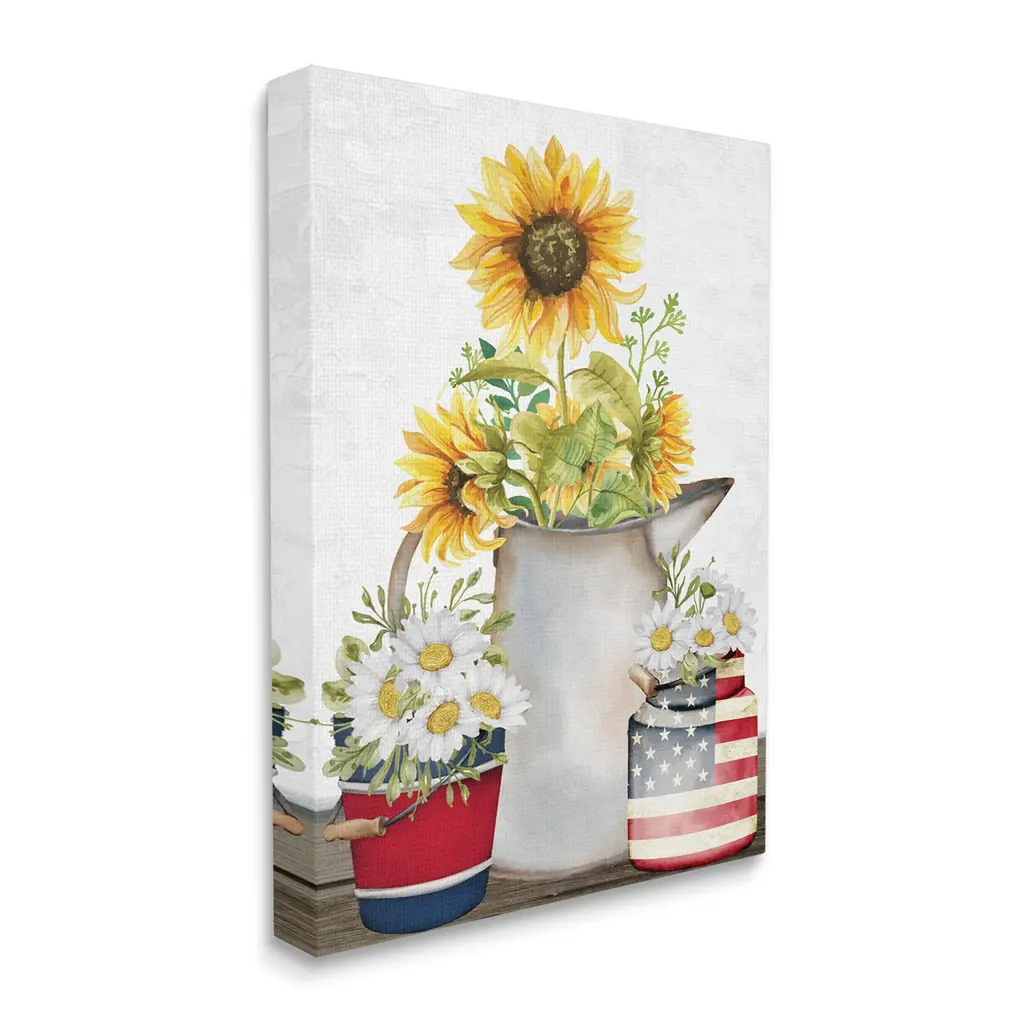 We create our stretched canvas to the highest standards. Using only the highest quality inks and canvas on Mimaki printers, we hand-cut and stretch each piece over a 1.5-inch thick wooden frame for hanging. As a result, the art comes ready to hang on the sturdy ledge with no installation required. Stupell Wall Art is made in the USA.Features: Dimensions: 16 x 1.5 x 20 InchesStretched Canvas Sizes Include Standard: 16 x 1.5 x 20 Large: 20 x 1.5 x 30 X-Large: 30 x 1.5 x 40 Oversized: 36 x 1.5 x 48Wall Art is Ready to Hang with Hardware Free Hanging. No installation required. For Easy Set Up Lean or Layer Artwork on Shelf or Against Wall.Our stretched canvas is created with the highest standards. We use only the highest quality inks and canvas on our in house Mimaki printers, and then hand cut and stretch each piece over a 1.5 inch thick wooden frame for hanging. Made In USA.Artwork Relates To: Flower, Plant, Flower Arrangement, Potted Plant, Sunflower, Daisy, Flower Bouquet, Watering Can, Gardening, Americana, Country, FloralDesign by Kim Allen