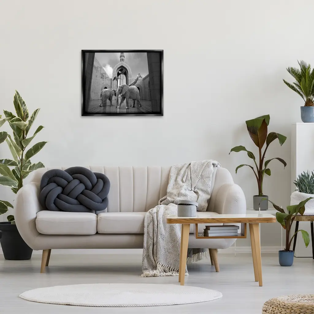 Elevate your home or office to the next level with Stupell Framed Floating Canvas Wall Art. Our premium hand-stretched canvas is mounted securely into a sturdy lightweight frame. The museum-style gap between the wrapped canvas and the box frame gives the illusion of floating artwork. Stupell Wall Art is made in the USA.Features: Dimensions: 21 x 1.7 x 17 Frame, 20 x 1.5 x 16 Canvas ArtFloating Frame Canvas Products are available in sizes 21"x17" and 31"x25". All Floating Frame Canvas Products have a 1.7" Depth.Wall Art is Ready to Hang with Hardware Free Hanging. No Installation required. For Easy Set Up Lean or Layer Artwork on Shelf or Against Wall. Artwork is Permently Fixed into the Frame.Our elevated 1.7" Thick Floating Frame is the perfect complement to our canvas style Wall Art. We use only the highest quality inks in house with industry leading printing solutions. Canvas is hand stretched over a durable wood foundation and then mounted securly into a Modern Box Frame. Made in the USA.Artwork Relates To: Architecture, Urban, City, Animal, Elephant, Giraffe, Safari, ArchDesign by Ziwei Li