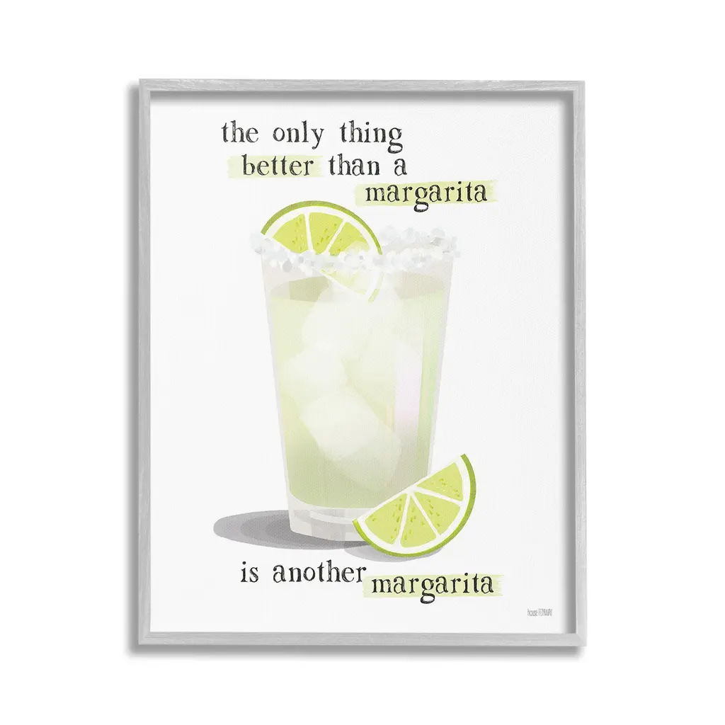 Elevate your home or office to the next level with Stupell Framed Floating Canvas Wall Art. Our premium hand-stretched canvas is mounted securely into a sturdy lightweight frame. The museum-style gap between the wrapped canvas and the box frame gives the illusion of floating artwork. Stupell Wall Art is made in the USA.Features: Dimensions: 17 x 1.7 x 21 Frame, 16 x 1.5 x 20 Canvas ArtFloating Frame Canvas Products are available in sizes 17"x21" and 25"x31". All Floating Frame Canvas Products have a 1.7" Depth.Wall Art is Ready to Hang with Hardware Free Hanging. No Installation required. For Easy Set Up Lean or Layer Artwork on Shelf or Against Wall. Artwork is Permently Fixed into the Frame.Our elevated 1.7" Thick Floating Frame is the perfect complement to our canvas style Wall Art. We use only the highest quality inks in house with industry leading printing solutions. Canvas is hand stretched over a durable wood foundation and then mounted securly into a Modern Box Frame. Made in the USA.Artwork Relates To: Beverage, Bar, Citrus, Fruit, Lime, Alcohol, Cocktail, Mojito, Margarita, The Only Thing Better than a Margarita is Another MargaritaDesign by House Fenway