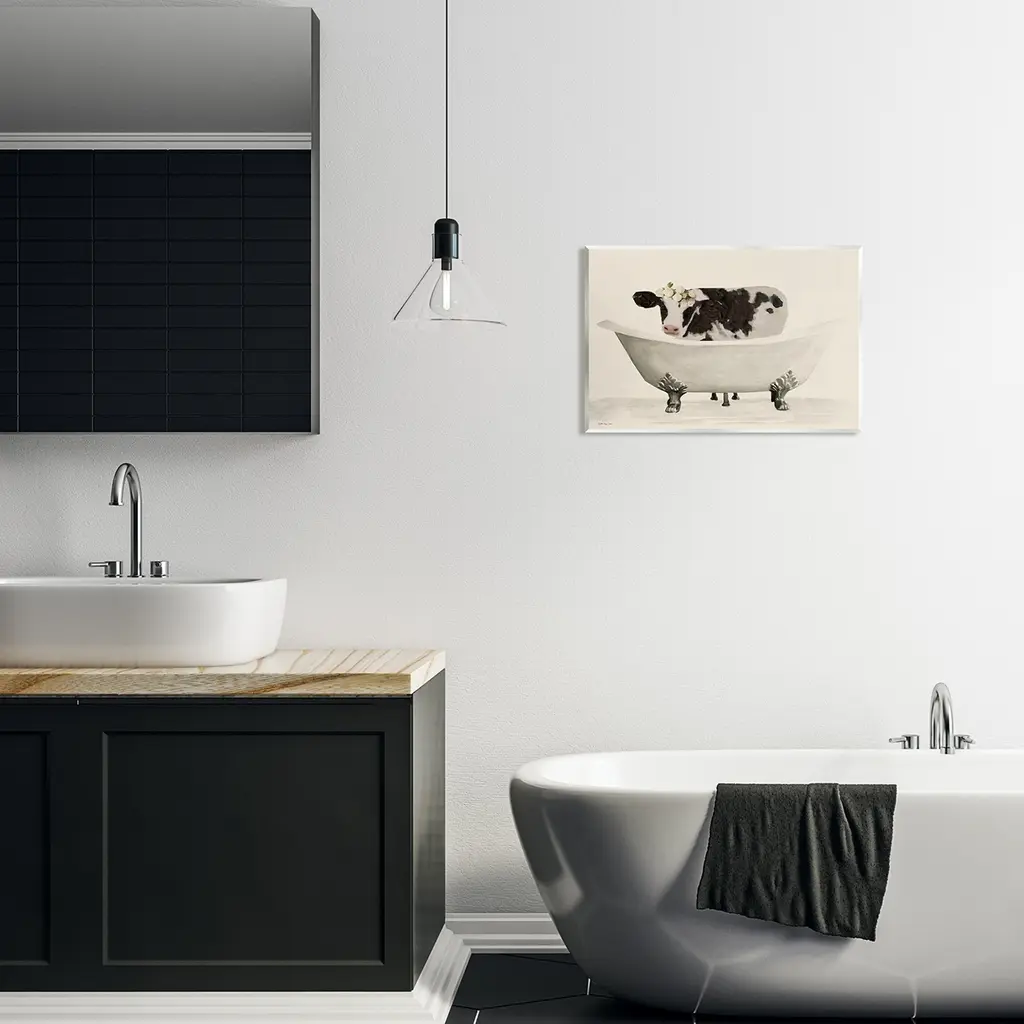Our wall plaques start as high-quality lithograph prints mounted on durable 0.5-inch thick MDF wood. Each piece is hand finished and comes with a fresh layer of white foil on the sides to give it a crisp, clean look. Plaques arrive ready to hang without installation and come with removable plastic corners to keep them from damage in transit. Stupell Wall Art is made in the USA.Features: Dimensions: 15 x 0.5 x 10 InchesWall Plaque Sizes Include Standard: 15 x 0.5 x 10 Oversized: 19 x 0.5 x 13Wall Art is Ready to Hang with Hardware Free Hanging. No installation required. For Easy Set Up Lean or Layer Artwork on Shelf or Against Wall.All of our wall plaques start off as high quality lithograph prints that are then mounted on durable 0.5 inch thick MDF wood. Each piece is hand finished and comes with a fresh layer of foil on the sides to give it a crisp clean look. Made In USA.Artwork Relates To: Animal, Bathing, Bathroom, Vintage, CowDesign by Stellar Design Studio