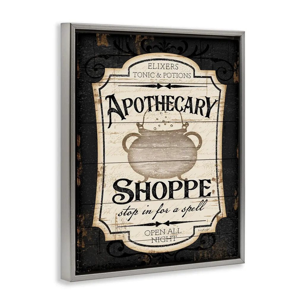 Elevate your home or office to the next level with Stupell Framed Floating Canvas Wall Art. Our premium hand-stretched canvas is mounted securely into a sturdy lightweight frame. The museum-style gap between the wrapped canvas and the box frame gives the illusion of floating artwork. Stupell Wall Art is made in the USA.Features: Dimensions: 17 x 1.7 x 21 Frame, 16 x 1.5 x 20 Canvas ArtFloating Frame Canvas Products are available in sizes 17"x21" and 25"x31". All Floating Frame Canvas Products have a 1.7" Depth.Wall Art is Ready to Hang with Hardware Free Hanging. No Installation required. For Easy Set Up Lean or Layer Artwork on Shelf or Against Wall. Artwork is Permently Fixed into the Frame.Our elevated 1.7" Thick Floating Frame is the perfect complement to our canvas style Wall Art. We use only the highest quality inks in house with industry leading printing solutions. Canvas is hand stretched over a durable wood foundation and then mounted securly into a Modern Box Frame. Made in the USA.Artwork Relates To: Halloween, Vintage, Rustic, Sign, PotionDesign by Jennifer Pugh