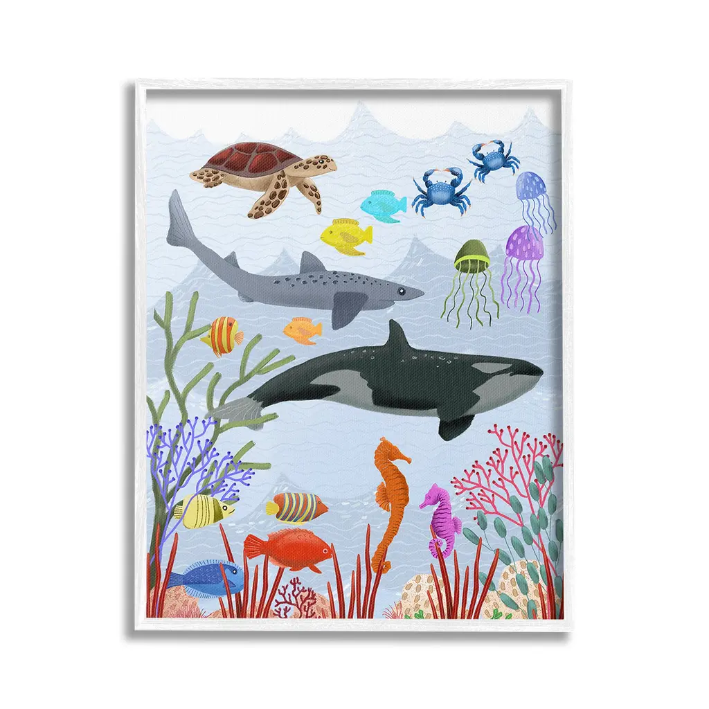 Elevate your home or office to the next level with Stupell Framed Floating Canvas Wall Art. Our premium hand-stretched canvas is mounted securely into a sturdy lightweight frame. The museum-style gap between the wrapped canvas and the box frame gives the illusion of floating artwork. Stupell Wall Art is made in the USA.Features: Dimensions: 17 x 1.7 x 21 Frame, 16 x 1.5 x 20 Canvas ArtFloating Frame Canvas Products are available in sizes 17"x21" and 25"x31". All Floating Frame Canvas Products have a 1.7" Depth.Wall Art is Ready to Hang with Hardware Free Hanging. No Installation required. For Easy Set Up Lean or Layer Artwork on Shelf or Against Wall. Artwork is Permently Fixed into the Frame.Our elevated 1.7" Thick Floating Frame is the perfect complement to our canvas style Wall Art. We use only the highest quality inks in house with industry leading printing solutions. Canvas is hand stretched over a durable wood foundation and then mounted securly into a Modern Box Frame. Made in the USA.Artwork Relates To: Animal, Sea Life, Fish, Shark, Nature, Reef, Sea, Water, Whale, Aquatic, UnderwaterDesign by Regina Moore
