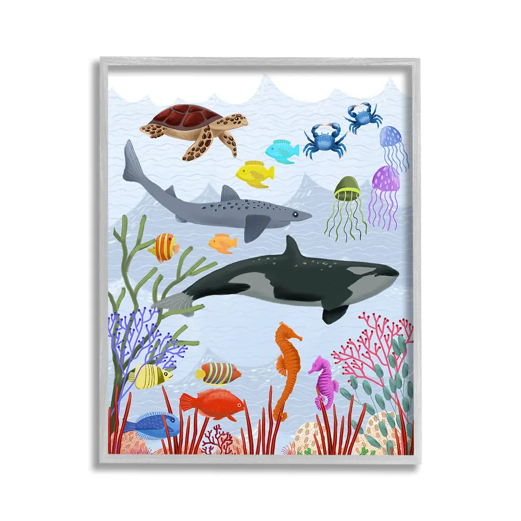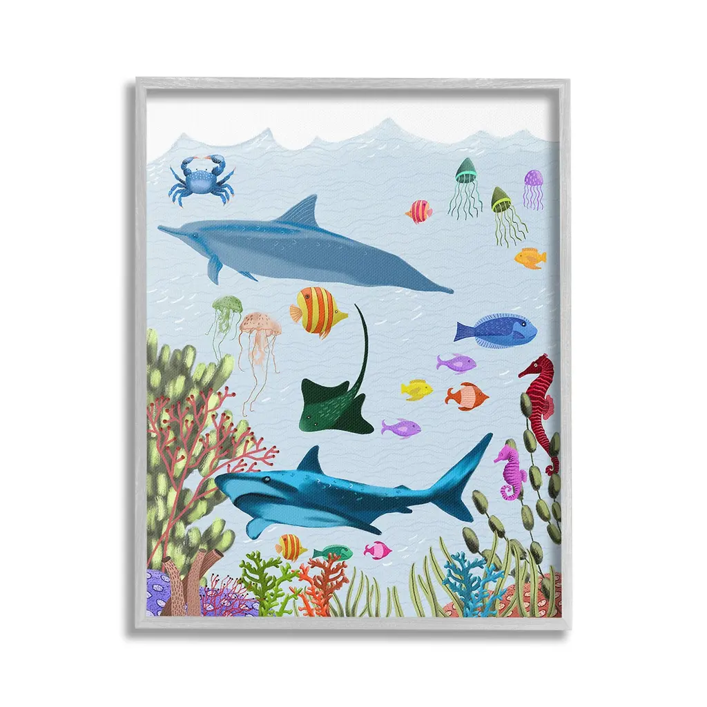 Add dimension to any room with our textured Framed Giclee Artwork. Our framed artwork is securely mounted into a 1.5-inch thick wood grain frame and ready to hang. Frames are available in three alluring styles: black, gray farmhouse and white. In addition, you should check out our oversized options if you want a statement piece. Stupell Wall Art is made in the USA.Features: Dimensions: 11 x 1.5 x 14 FramedFramed Giclee Products are available in the sizes 11"x14", 16"x20" or 24"x30". All Framed Giclee Products have a 1.5" Depth. Wall Art is Ready to Hang with Hardware Free Hanging. No installation required. For Easy Set Up Lean or Layer Artwork on Shelf or Against Wall.Our giclée prints are carefully mounted on a durable MDF backing, and then perfectly finished in a 1.5 inch thick woodgrain frame. Mounted frame colors include black, gray farmhouse and white. Made In USA.Artwork Relates To: Animal, Sea Life, Fish, Shark, Nature, Reef, Sea, Water, Whale, Aquatic, UnderwaterDesign by Regina Moore