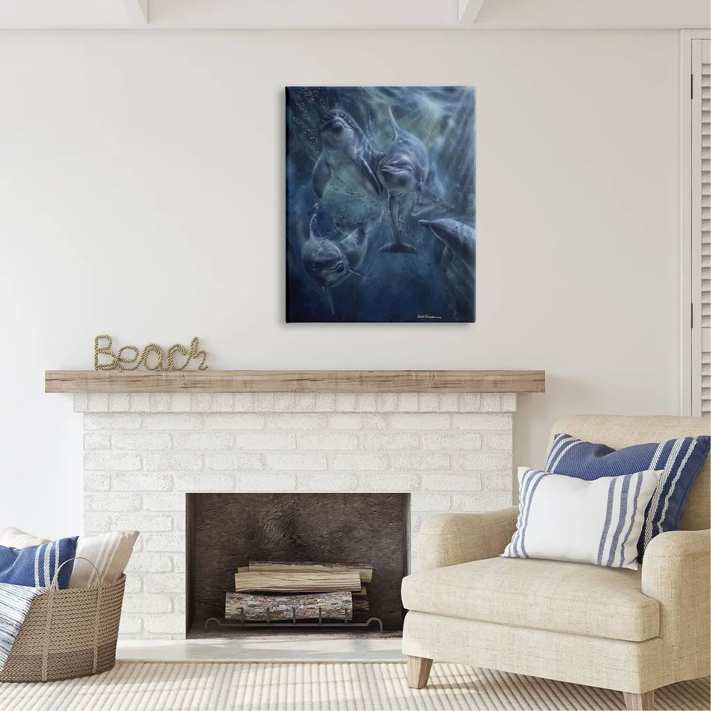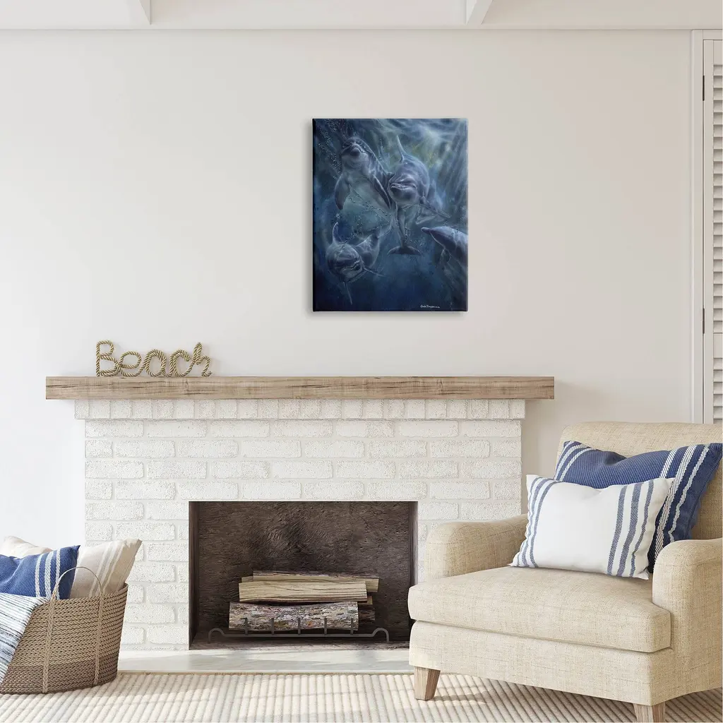 We create our stretched canvas to the highest standards. Using only the highest quality inks and canvas on Mimaki printers, we hand-cut and stretch each piece over a 1.5-inch thick wooden frame for hanging. As a result, the art comes ready to hang on the sturdy ledge with no installation required. Stupell Wall Art is made in the USA.Features: Dimensions: 16 x 1.5 x 20 InchesStretched Canvas Sizes Include Standard: 16 x 1.5 x 20 Large: 20 x 1.5 x 30 X-Large: 30 x 1.5 x 40 Oversized: 36 x 1.5 x 48Wall Art is Ready to Hang - No Installation or Hardware Needed. For Easy Set Up Lean or Layer Artwork on Shelf or Against Wall.Our stretched canvas is created with the highest standards. We use only the highest quality inks and canvas on our in house Mimaki printers, and then hand cut and stretch each piece over a 1.5 inch thick wooden frame for hanging. Made In USA.Artwork Relates To: Animal, Dolphin, Mammal, Sea Life, Aquatic, Water, Fish, UnderwaterDesign by Linda Thompson