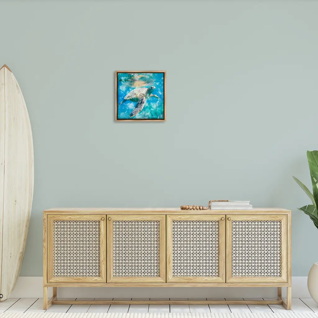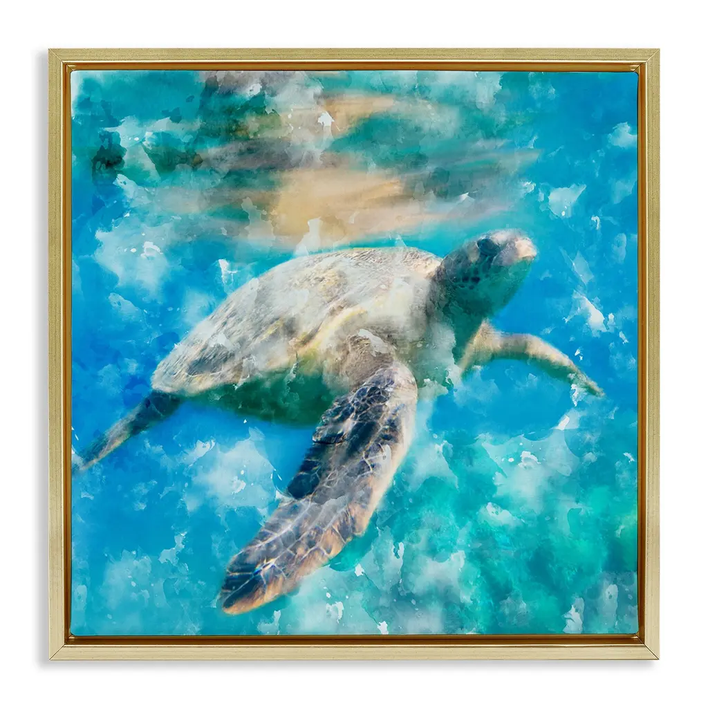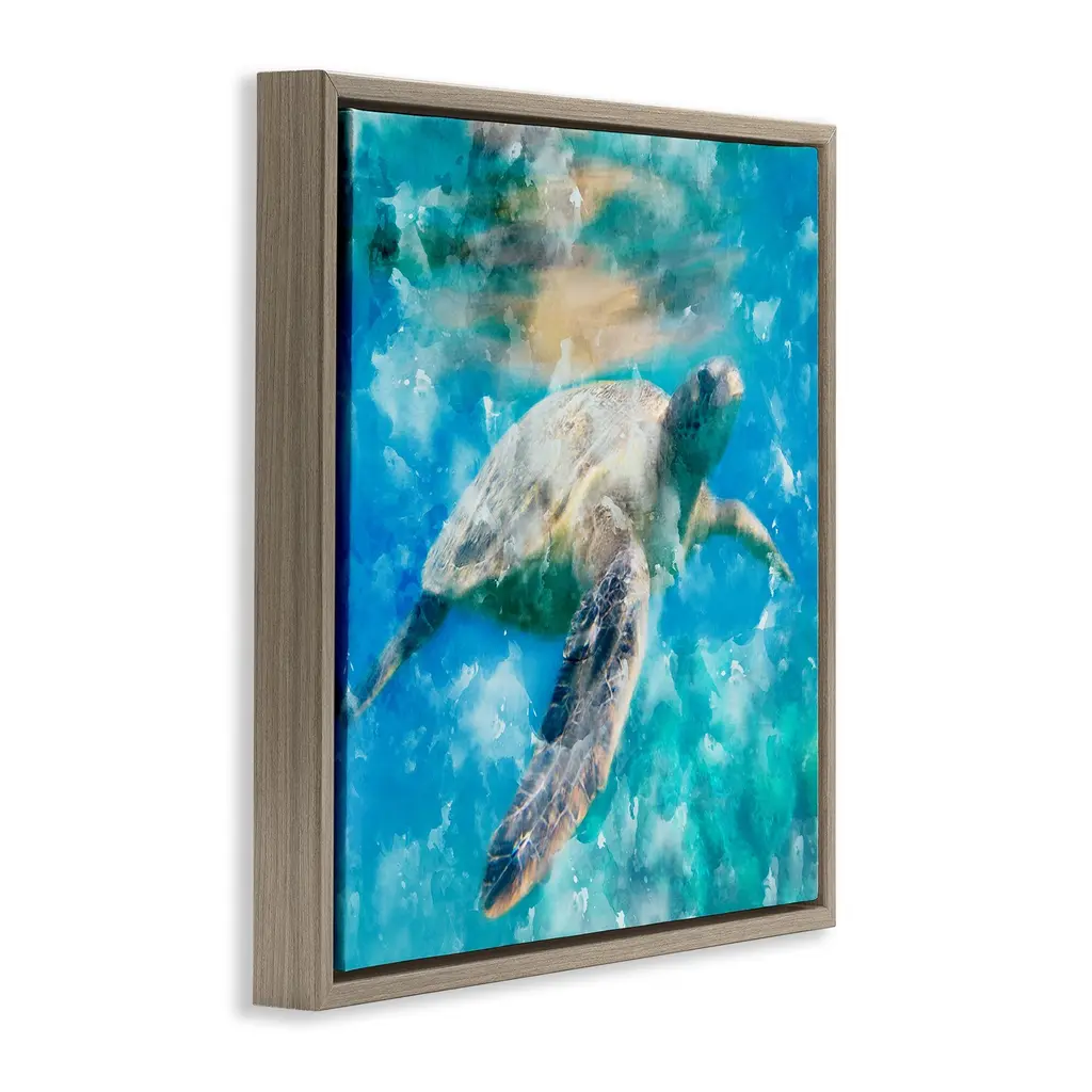 Elevate your home or office to the next level with Stupell Framed Floating Canvas Wall Art. Our premium hand-stretched canvas is mounted securely into a sturdy lightweight frame. The museum-style gap between the wrapped canvas and the box frame gives the illusion of floating artwork. Stupell Wall Art is made in the USA.Features: Dimensions: 18 x 1.7 x 18 Frame, 17 x 1.5 x 17 Canvas ArtFloating Frame Canvas Products are available in sizes 18"x18" and 25"x25". All Floating Frame Canvas Products have a 1.7" Depth.Wall Art is Ready to Hang with Hardware Free Hanging. No Installation required. For Easy Set Up Lean or Layer Artwork on Shelf or Against Wall. Artwork is Permently Fixed into the Frame.Our elevated 1.7" Thick Floating Frame is the perfect complement to our canvas style Wall Art. We use only the highest quality inks in house with industry leading printing solutions. Canvas is hand stretched over a durable wood foundation and then mounted securly into a Modern Box Frame. Made in the USA.Artwork Relates To: Nautical, Animal, Turtle, Underwater, Sea Life, MarineDesign by Kim Allen