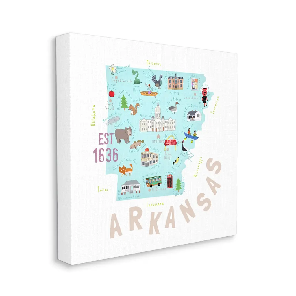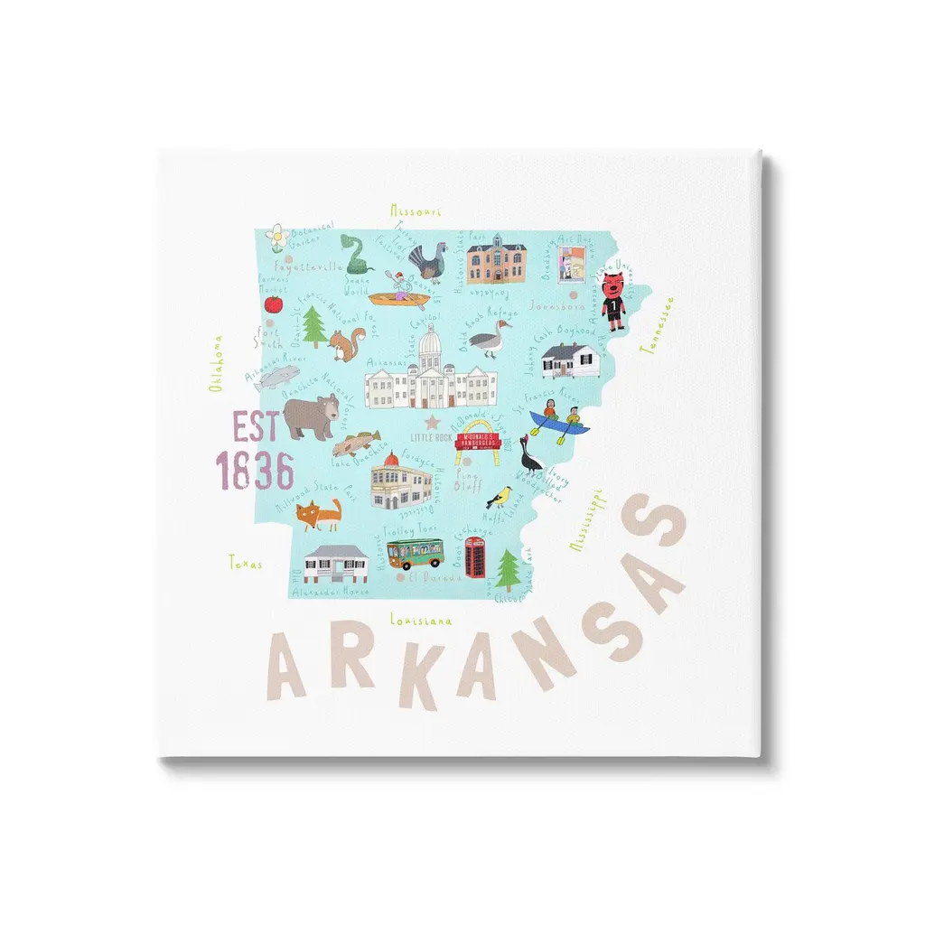 We create our stretched canvas to the highest standards. Using only the highest quality inks and canvas on Mimaki printers, we hand-cut and stretch each piece over a 1.5-inch thick wooden frame for hanging. As a result, the art comes ready to hang on the sturdy ledge with no installation required. Stupell Wall Art is made in the USA.Features: Dimensions: 17 x 1.5 x 17 InchesStretched Canvas Sizes Include Standard: 17 x 1.5 x 17 Large: 24 x 1.5 x 24 X-Large: 30 x 1.5 x 30 Oversized: 36 x 1.5 x 36Wall Art is Ready to Hang - No Installation or Hardware Needed. For Easy Set Up Lean or Layer Artwork on Shelf or Against Wall.Our stretched canvas is created with the highest standards. We use only the highest quality inks and canvas on our in house Mimaki printers, and then hand cut and stretch each piece over a 1.5 inch thick wooden frame for hanging. Made In USA.Artwork Relates To: USA, State, Landmarks, Map, Diagram, ArkansasDesign by Carla Daly