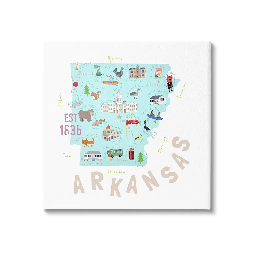 We create our stretched canvas to the highest standards. Using only the highest quality inks and canvas on Mimaki printers, we hand-cut and stretch each piece over a 1.5-inch thick wooden frame for hanging. As a result, the art comes ready to hang on the sturdy ledge with no installation required. Stupell Wall Art is made in the USA.Features: Dimensions: 17 x 1.5 x 17 InchesStretched Canvas Sizes Include Standard: 17 x 1.5 x 17 Large: 24 x 1.5 x 24 X-Large: 30 x 1.5 x 30 Oversized: 36 x 1.5 x 36Wall Art is Ready to Hang - No Installation or Hardware Needed. For Easy Set Up Lean or Layer Artwork on Shelf or Against Wall.Our stretched canvas is created with the highest standards. We use only the highest quality inks and canvas on our in house Mimaki printers, and then hand cut and stretch each piece over a 1.5 inch thick wooden frame for hanging. Made In USA.Artwork Relates To: USA, State, Landmarks, Map, Diagram, ArkansasDesign by Carla Daly