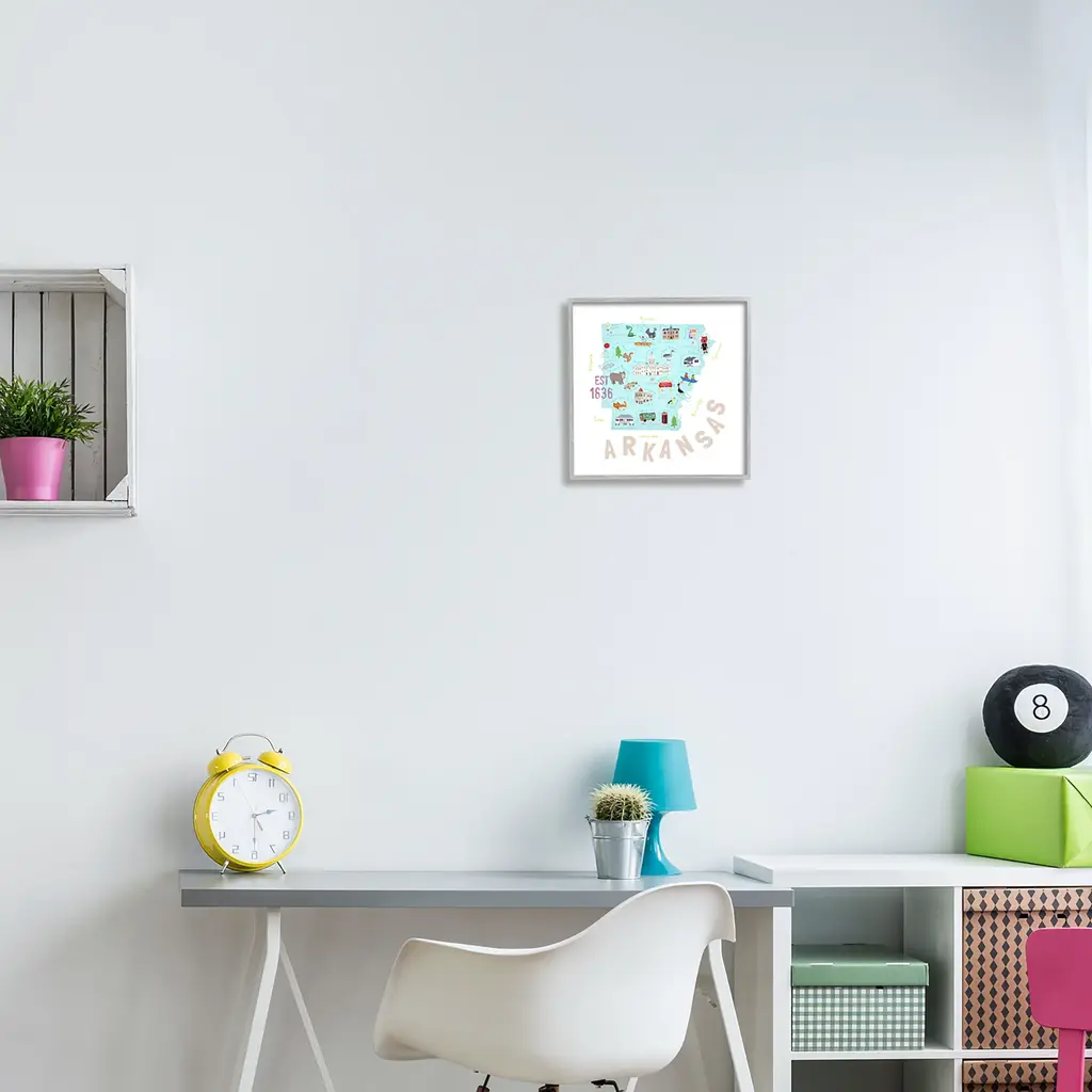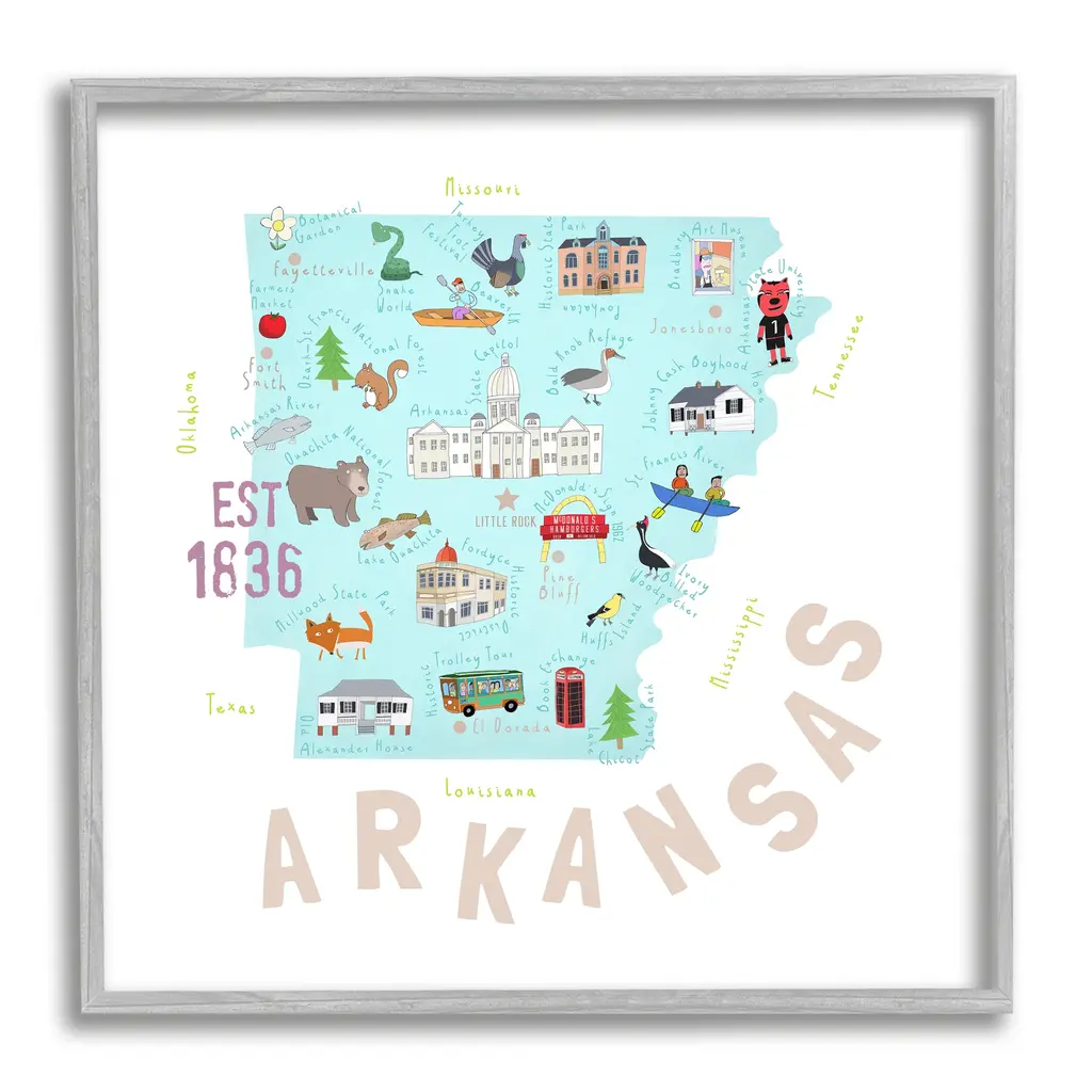 Add dimension to any room with our textured Framed Giclee Artwork. Our framed artwork is securely mounted into a 1.5-inch thick wood grain frame and ready to hang. Frames are available in three alluring styles: black, gray farmhouse and white. In addition, you should check out our oversized options if you want a statement piece. Stupell Wall Art is made in the USA.Features: Dimensions: 12 x 1.5 x 12 FramedFramed Giclee Sizes Include Standard: 12 x 1.5 x 12 Large: 17 x 1.5 x 17 Oversized: 24 x 1.5 x 24Wall Art is Ready to Hang - No Installation or Hardware Needed. For Easy Set Up Lean or Layer Artwork on Shelf or Against Wall.Our giclée prints are carefully mounted on a durable MDF backing, and then perfectly finished in a 1.5 inch thick woodgrain frame. Mounted frame colors include black, gray farmhouse and white. Made In USA.Artwork Relates To: USA, State, Landmarks, Map, Diagram, ArkansasDesign by Carla Daly