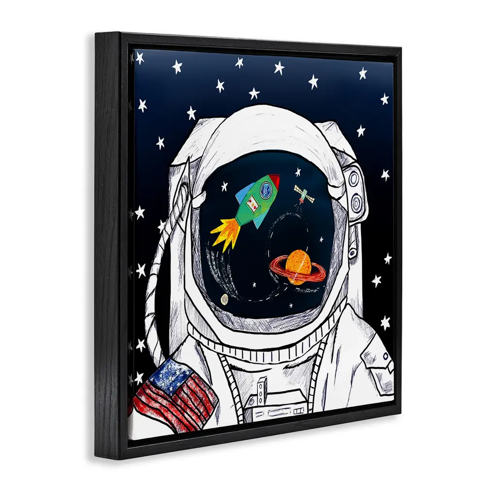 Elevate your home or office to the next level with Stupell Framed Floating Canvas Wall Art. Our premium hand-stretched canvas is mounted securely into a sturdy lightweight frame. The museum-style gap between the wrapped canvas and the box frame gives the illusion of floating artwork. Stupell Wall Art is made in the USA.Features: Dimensions: 18 x 1.7 x 18 Frame, 17 x 1.5 x 17 Canvas ArtFloating Frame Canvas Products are available in sizes 18"x18" and 25"x25". All Floating Frame Canvas Products have a 1.7" Depth.Wall Art is Ready to Hang with Hardware Free Hanging. No Installation required. For Easy Set Up Lean or Layer Artwork on Shelf or Against Wall. Artwork is Permently Fixed into the Frame.Our elevated 1.7" Thick Floating Frame is the perfect complement to our canvas style Wall Art. We use only the highest quality inks in house with industry leading printing solutions. Canvas is hand stretched over a durable wood foundation and then mounted securly into a Modern Box Frame. Made in the USA.Artwork Relates To: Outer Space, Astronaut, Galaxy, Rocketship, Planet, Space Ship, StarsDesign by Sangita Bachelet