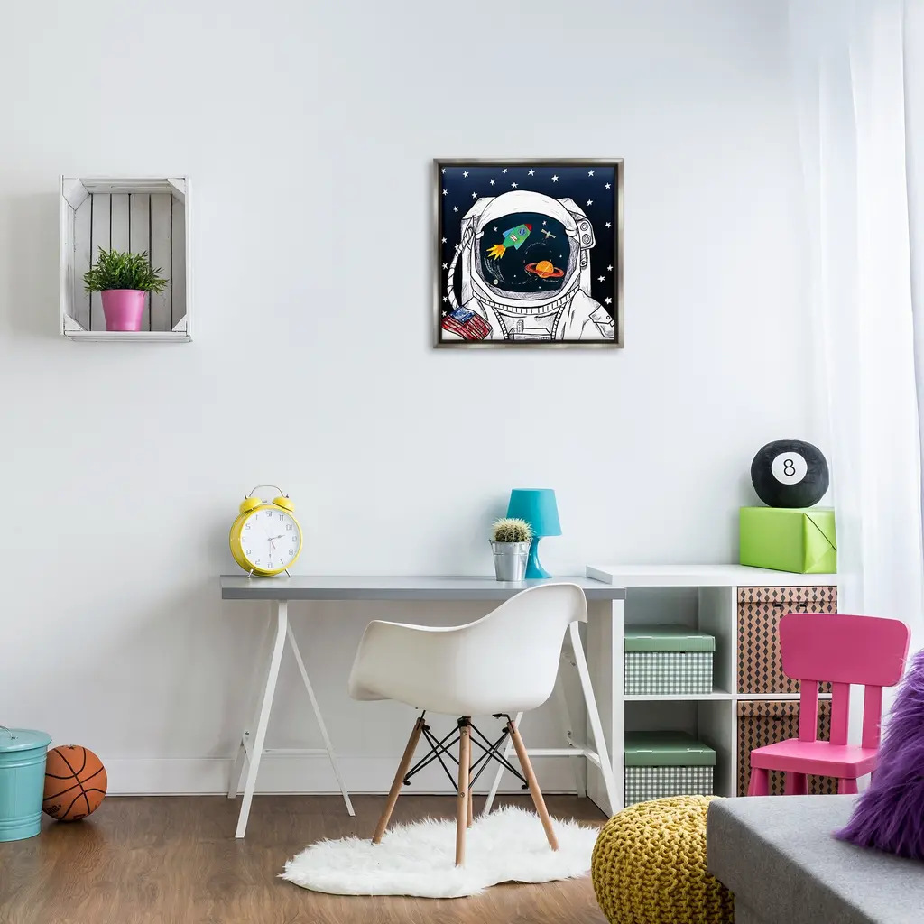 Elevate your home or office to the next level with Stupell Framed Floating Canvas Wall Art. Our premium hand-stretched canvas is mounted securely into a sturdy lightweight frame. The museum-style gap between the wrapped canvas and the box frame gives the illusion of floating artwork. Stupell Wall Art is made in the USA.Features: Dimensions: 18 x 1.7 x 18 Frame, 17 x 1.5 x 17 Canvas ArtFloating Frame Canvas Products are available in sizes 18"x18" and 25"x25". All Floating Frame Canvas Products have a 1.7" Depth.Wall Art is Ready to Hang with Hardware Free Hanging. No Installation required. For Easy Set Up Lean or Layer Artwork on Shelf or Against Wall. Artwork is Permently Fixed into the Frame.Our elevated 1.7" Thick Floating Frame is the perfect complement to our canvas style Wall Art. We use only the highest quality inks in house with industry leading printing solutions. Canvas is hand stretched over a durable wood foundation and then mounted securly into a Modern Box Frame. Made in the USA.Artwork Relates To: Outer Space, Astronaut, Galaxy, Rocketship, Planet, Space Ship, StarsDesign by Sangita Bachelet
