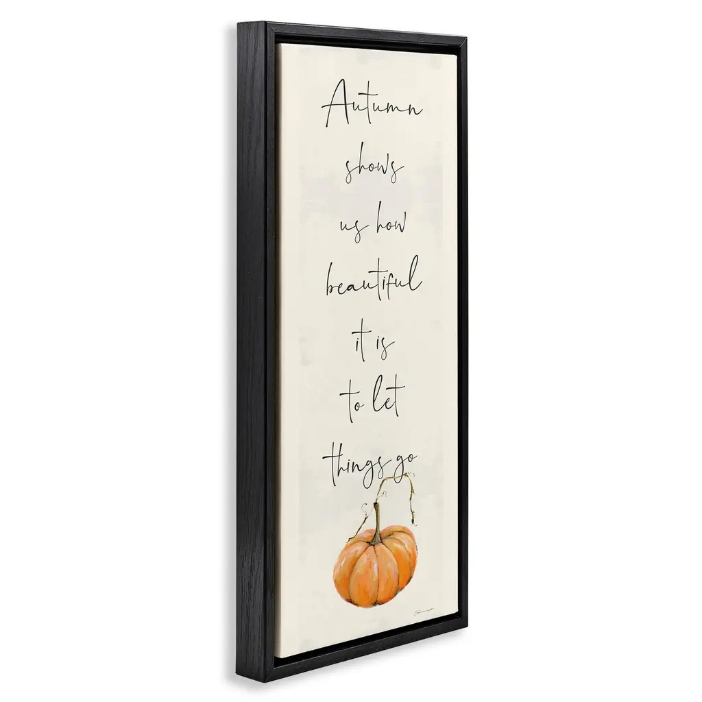 Elevate your home or office to the next level with Stupell Framed Floating Canvas Wall Art. Our premium hand-stretched canvas is mounted securely into a sturdy lightweight frame. The museum-style gap between the wrapped canvas and the box frame gives the illusion of floating artwork. Stupell Wall Art is made in the USA.Features: Dimensions: 11 x 1.7 x 25 Frame, 10 x 1.5 x 24 Canvas ArtFloating Frame Canvas Products are available in sizes 11"x25" and 14"x31". All Floating Frame Canvas Products have a 1.7" Depth.Wall Art is Ready to Hang with Hardware Free Hanging. No Installation required. For Easy Set Up Lean or Layer Artwork on Shelf or Against Wall. Artwork is Permently Fixed into the Frame.Our elevated 1.7" Thick Floating Frame is the perfect complement to our canvas style Wall Art. We use only the highest quality inks in house with industry leading printing solutions. Canvas is hand stretched over a durable wood foundation and then mounted securly into a Modern Box Frame. Made in the USA.Artwork Relates To: Seasonal, Fall, Autumn, Pumpkin, PhraseDesign by Stephanie Workman Marrott