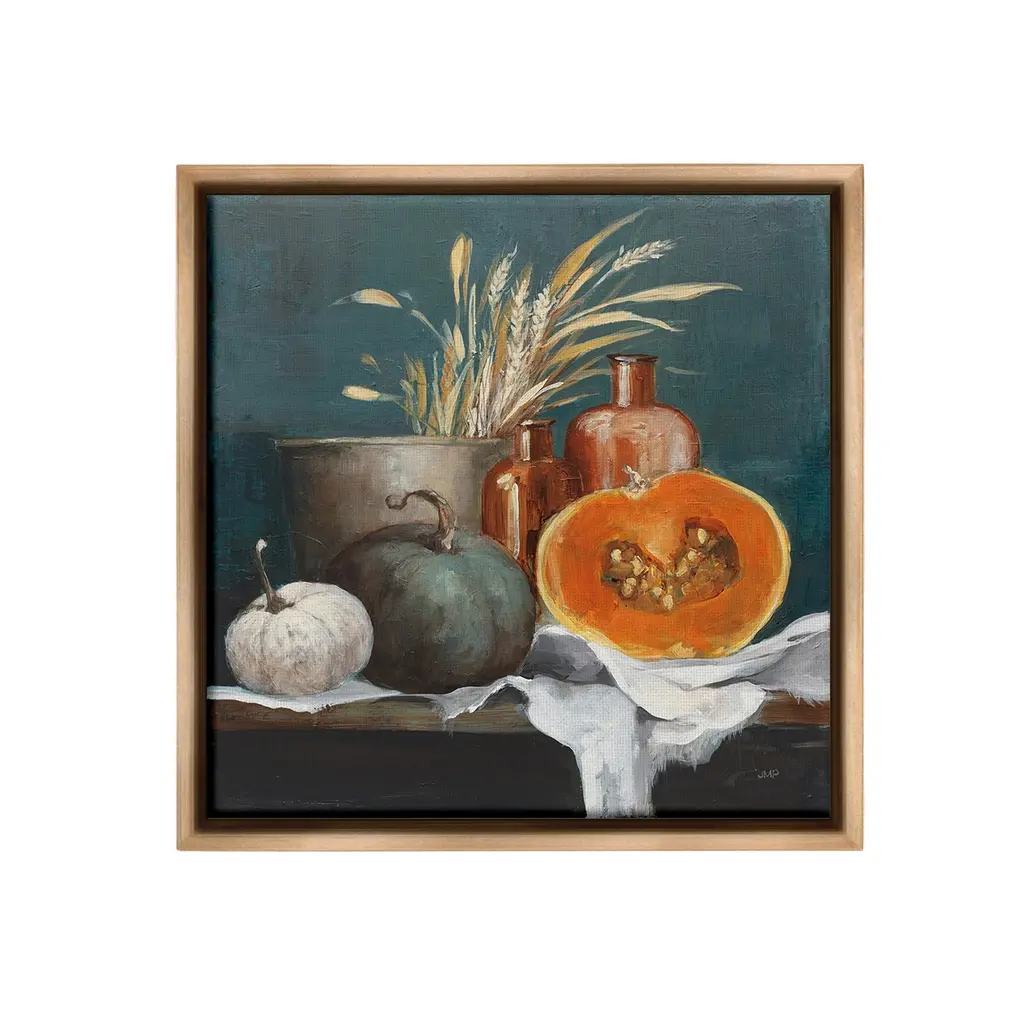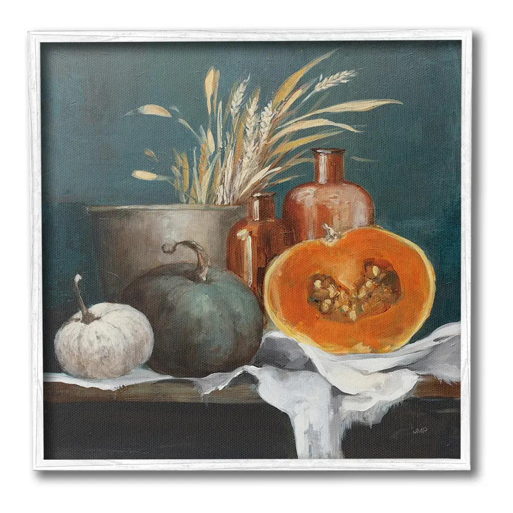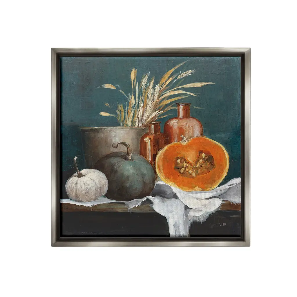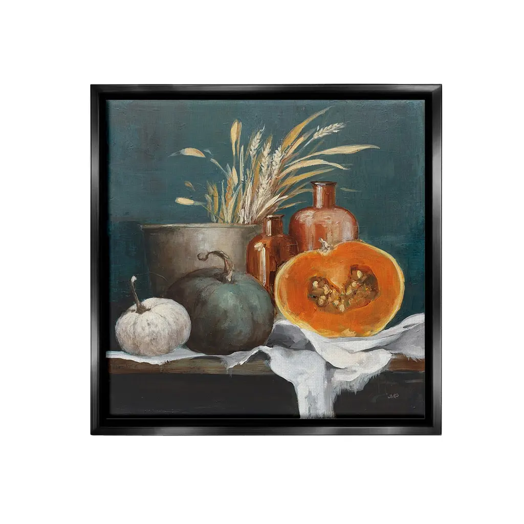 Elevate your home or office to the next level with Stupell Framed Floating Canvas Wall Art. Our premium hand-stretched canvas is mounted securely into a sturdy lightweight frame. The museum-style gap between the wrapped canvas and the box frame gives the illusion of floating artwork. Stupell Wall Art is made in the USA.Features: Dimensions: 18 x 1.7 x 18 Frame, 17 x 1.5 x 17 Canvas ArtFloating Frame Canvas Products are available in sizes 18"x18" and 25"x25". All Floating Frame Canvas Products have a 1.7" Depth.Wall Art is Ready to Hang with Hardware Free Hanging. No Installation required. For Easy Set Up Lean or Layer Artwork on Shelf or Against Wall. Artwork is Permently Fixed into the Frame.Our elevated 1.7" Thick Floating Frame is the perfect complement to our canvas style Wall Art. We use only the highest quality inks in house with industry leading printing solutions. Canvas is hand stretched over a durable wood foundation and then mounted securly into a Modern Box Frame. Made in the USA.Artwork Relates To: Plant, Flower, Dahlia, Pumpkin, Vegetable, Pottery, Vase, Still Life, Fall, Autumn, Foliage, Bouquet, Floral, BotanicalDesign by Julia Purinton