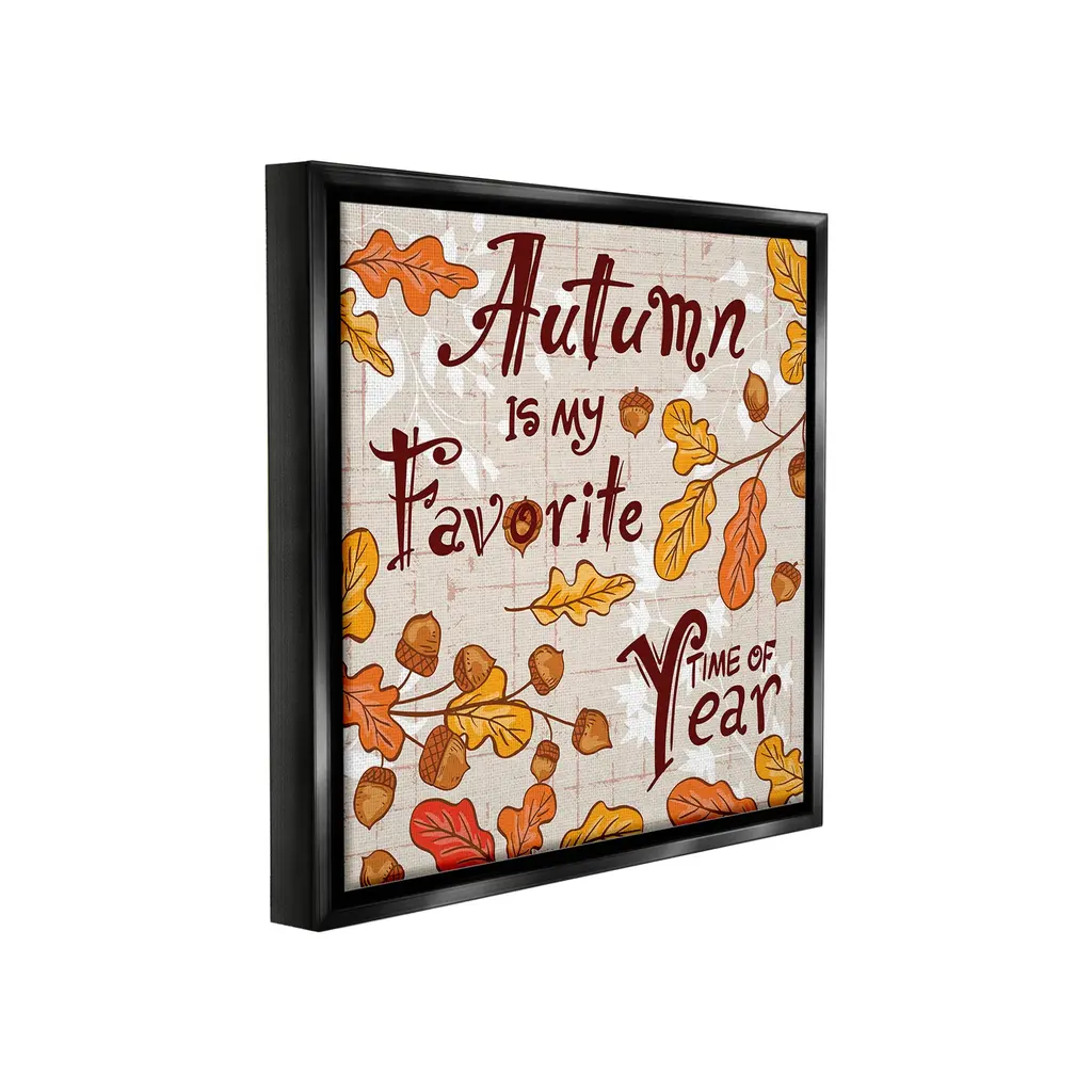 Elevate your home or office to the next level with Stupell Framed Floating Canvas Wall Art. Our premium hand-stretched canvas is mounted securely into a sturdy lightweight frame. The museum-style gap between the wrapped canvas and the box frame gives the illusion of floating artwork. Stupell Wall Art is made in the USA.Features: Dimensions: 18 x 1.7 x 18 Frame, 17 x 1.5 x 17 Canvas ArtFloating Frame Canvas Products are available in sizes 18"x18" and 25"x25". All Floating Frame Canvas Products have a 1.7" Depth.Wall Art is Ready to Hang with Hardware Free Hanging. No Installation required. For Easy Set Up Lean or Layer Artwork on Shelf or Against Wall. Artwork is Permently Fixed into the Frame.Our elevated 1.7" Thick Floating Frame is the perfect complement to our canvas style Wall Art. We use only the highest quality inks in house with industry leading printing solutions. Canvas is hand stretched over a durable wood foundation and then mounted securly into a Modern Box Frame. Made in the USA.Artwork Relates To: Nature, Country, Harvest, Plant, Fall, Autumn, Phrase, Pattern, Acorn, Autumn is my Favorite Time of YearDesign by Diane Labombarbe
