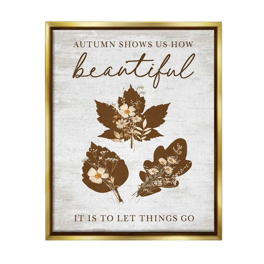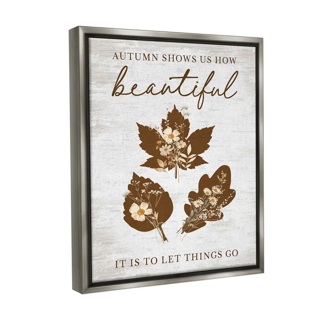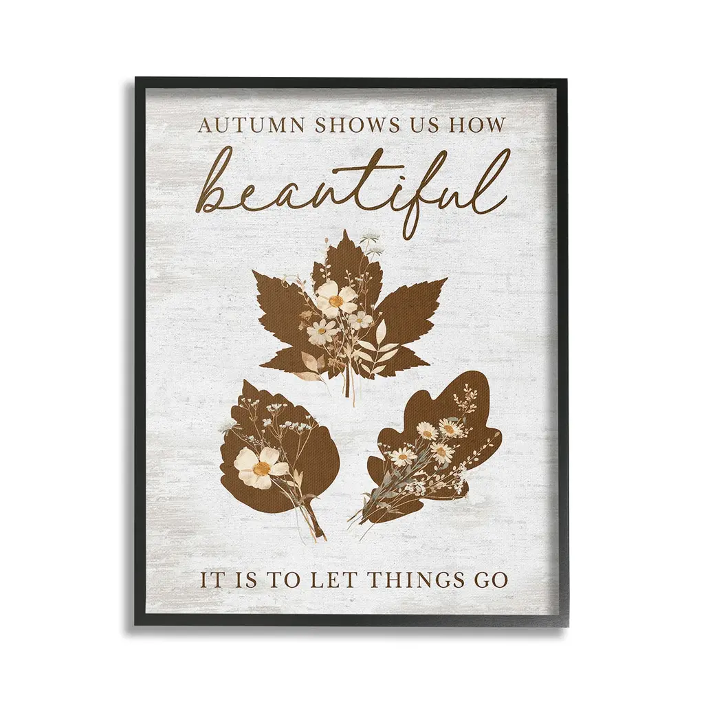 Elevate your home or office to the next level with Stupell Framed Floating Canvas Wall Art. Our premium hand-stretched canvas is mounted securely into a sturdy lightweight frame. The museum-style gap between the wrapped canvas and the box frame gives the illusion of floating artwork. Stupell Wall Art is made in the USA.Features: Dimensions: 17 x 1.7 x 21 Frame, 16 x 1.5 x 20 Canvas ArtFloating Frame Canvas Products are available in sizes 17"x21" and 25"x31". All Floating Frame Canvas Products have a 1.7" Depth.Wall Art is Ready to Hang with Hardware Free Hanging. No Installation required. For Easy Set Up Lean or Layer Artwork on Shelf or Against Wall. Artwork is Permently Fixed into the Frame.Our elevated 1.7" Thick Floating Frame is the perfect complement to our canvas style Wall Art. We use only the highest quality inks in house with industry leading printing solutions. Canvas is hand stretched over a durable wood foundation and then mounted securly into a Modern Box Frame. Made in the USA.Artwork Relates To: Phrase, Fall, Autumn, Rustic, Botanical, Leaf, Flower, Floral, Inspirational, Autumn Shows Us How Beautiful It Is To Let Things GoDesign by Lettered and Lined