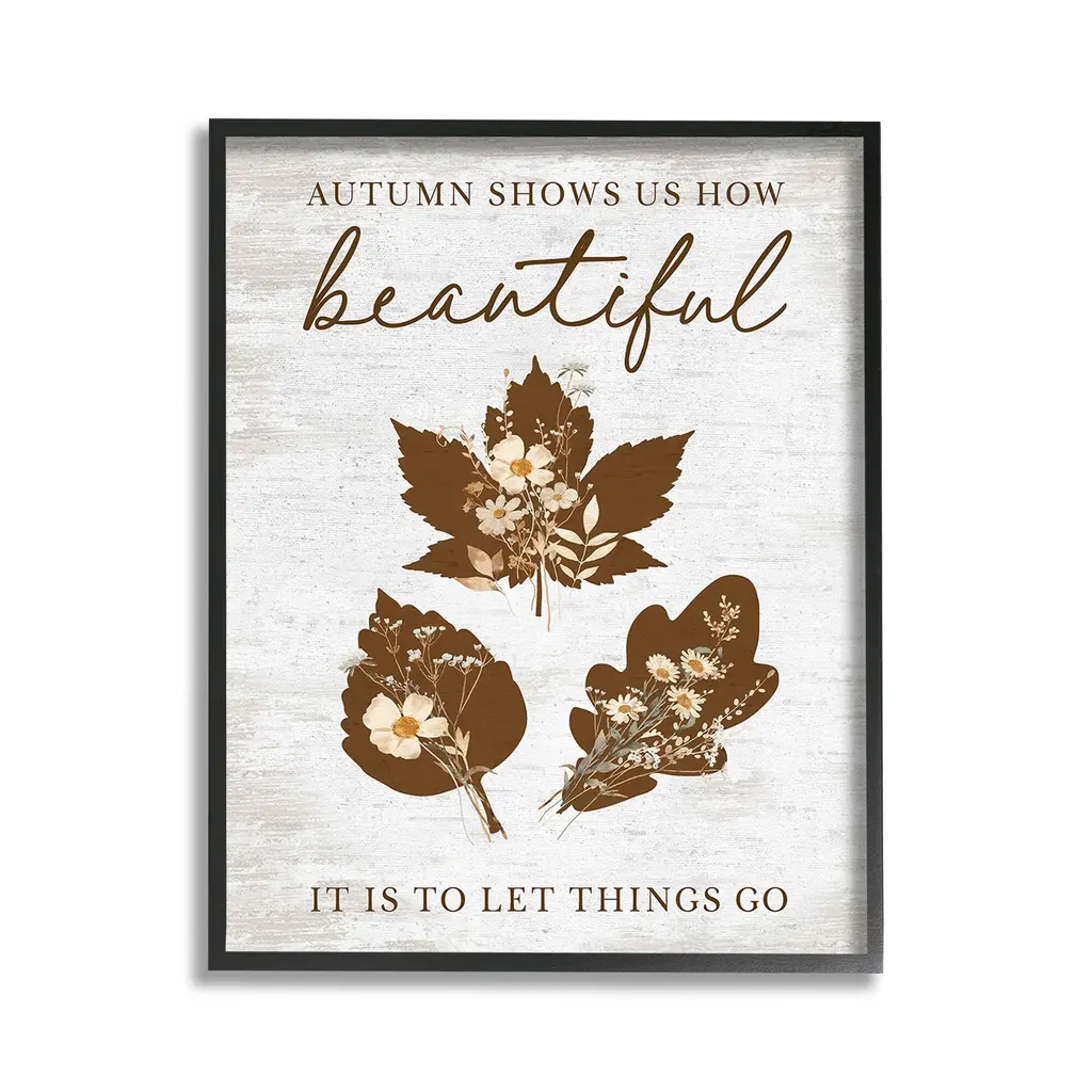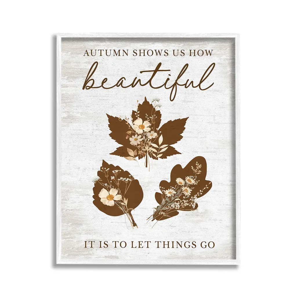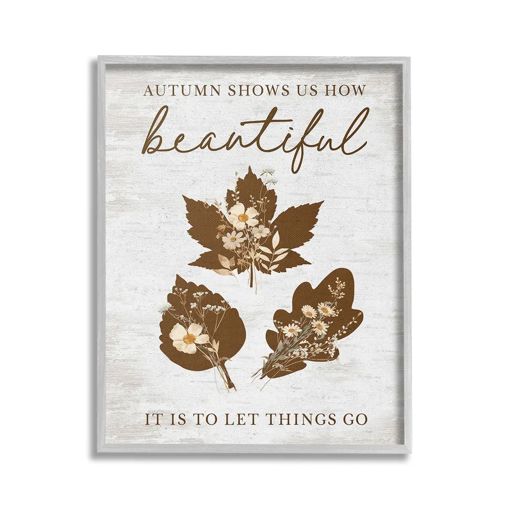 Elevate your home or office to the next level with Stupell Framed Floating Canvas Wall Art. Our premium hand-stretched canvas is mounted securely into a sturdy lightweight frame. The museum-style gap between the wrapped canvas and the box frame gives the illusion of floating artwork. Stupell Wall Art is made in the USA.Features: Dimensions: 17 x 1.7 x 21 Frame, 16 x 1.5 x 20 Canvas ArtFloating Frame Canvas Products are available in sizes 17"x21" and 25"x31". All Floating Frame Canvas Products have a 1.7" Depth.Wall Art is Ready to Hang with Hardware Free Hanging. No Installation required. For Easy Set Up Lean or Layer Artwork on Shelf or Against Wall. Artwork is Permently Fixed into the Frame.Our elevated 1.7" Thick Floating Frame is the perfect complement to our canvas style Wall Art. We use only the highest quality inks in house with industry leading printing solutions. Canvas is hand stretched over a durable wood foundation and then mounted securly into a Modern Box Frame. Made in the USA.Artwork Relates To: Phrase, Fall, Autumn, Rustic, Botanical, Leaf, Flower, Floral, Inspirational, Autumn Shows Us How Beautiful It Is To Let Things GoDesign by Lettered and Lined