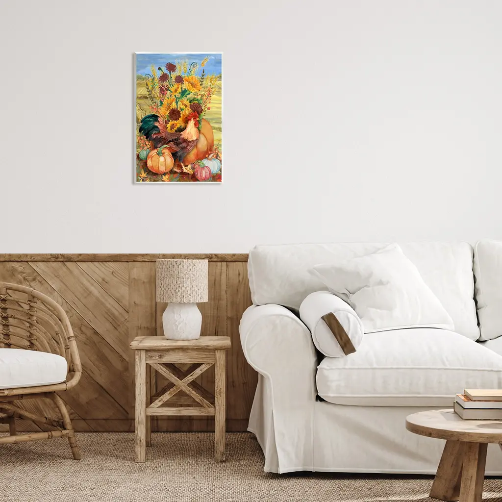 Our wall plaques start as high-quality lithograph prints mounted on durable 0.5-inch thick MDF wood. Each piece is hand finished and comes with a fresh layer of white foil on the sides to give it a crisp, clean look. Plaques arrive ready to hang without installation and come with removable plastic corners to keep them from damage in transit. Wall Art is made in the USA.Features: Dimensions: 10 x 0.5 x 15 InchesWall Plaque Sizes Include Standard: 10 x 0.5 x 15 Oversized: 13 x 0.5 x 19Wall Art is Ready to Hang with Hardware Free Hanging. No installation required. For Easy Set Up Lean or Layer Artwork on Shelf or Against Wall.All of our wall plaques start off as high quality lithograph prints that are then mounted on durable 0.5 inch thick MDF wood. Each piece is hand finished and comes with a fresh layer of foil on the sides to give it a crisp clean look. Made In USA.Artwork Relates To: Plant, Flower, Flower Bouquet, Nature, Countryside, Sunflower, Fall, Autumn, Farm, Pumpkin, Hen, RoosterDesign by Paul Brent