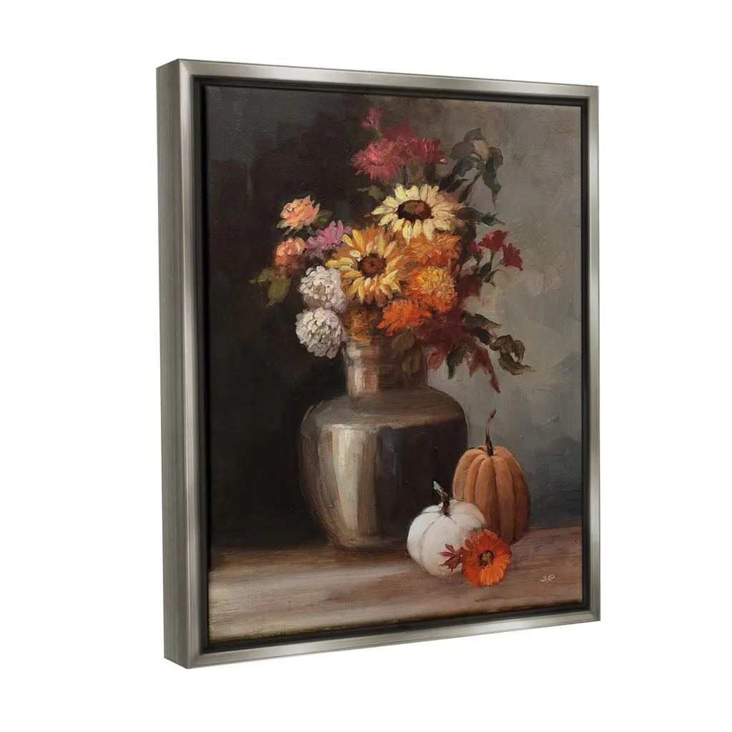 Elevate your home or office to the next level with Stupell Framed Floating Canvas Wall Art. Our premium hand-stretched canvas is mounted securely into a sturdy lightweight frame. The museum-style gap between the wrapped canvas and the box frame gives the illusion of floating artwork. Stupell Wall Art is made in the USA.Features: Dimensions: 17 x 1.7 x 21 Frame, 16 x 1.5 x 20 Canvas ArtFloating Frame Canvas Products are available in sizes 17"x21" and 25"x31". All Floating Frame Canvas Products have a 1.7" Depth.Wall Art is Ready to Hang with Hardware Free Hanging. No Installation required. For Easy Set Up Lean or Layer Artwork on Shelf or Against Wall. Artwork is Permently Fixed into the Frame.Our elevated 1.7" Thick Floating Frame is the perfect complement to our canvas style Wall Art. We use only the highest quality inks in house with industry leading printing solutions. Canvas is hand stretched over a durable wood foundation and then mounted securly into a Modern Box Frame. Made in the USA.Artwork Relates To: Plant, Flower, Dahlia, Pumpkin, Vegetable, Pottery, Vase, Still Life, Fall, Autumn, Foliage, Bouquet, Floral, BotanicalDesign by Julia Purinton