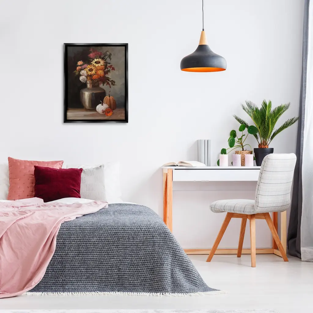 Elevate your home or office to the next level with Stupell Framed Floating Canvas Wall Art. Our premium hand-stretched canvas is mounted securely into a sturdy lightweight frame. The museum-style gap between the wrapped canvas and the box frame gives the illusion of floating artwork. Stupell Wall Art is made in the USA.Features: Dimensions: 17 x 1.7 x 21 Frame, 16 x 1.5 x 20 Canvas ArtFloating Frame Canvas Products are available in sizes 17"x21" and 25"x31". All Floating Frame Canvas Products have a 1.7" Depth.Wall Art is Ready to Hang with Hardware Free Hanging. No Installation required. For Easy Set Up Lean or Layer Artwork on Shelf or Against Wall. Artwork is Permently Fixed into the Frame.Our elevated 1.7" Thick Floating Frame is the perfect complement to our canvas style Wall Art. We use only the highest quality inks in house with industry leading printing solutions. Canvas is hand stretched over a durable wood foundation and then mounted securly into a Modern Box Frame. Made in the USA.Artwork Relates To: Plant, Flower, Dahlia, Pumpkin, Vegetable, Pottery, Vase, Still Life, Fall, Autumn, Foliage, Bouquet, Floral, BotanicalDesign by Julia Purinton