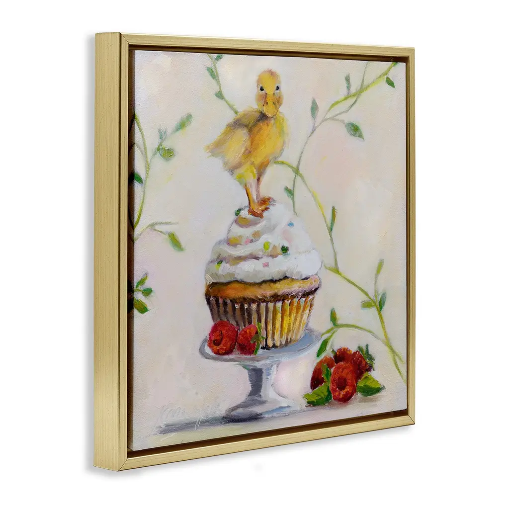 Stupell Baby Duck On Raspberry Cupcake Framed Floater Canvas Wall Art Design By Karen Weber Fine Art - 18 X 18 - Gold