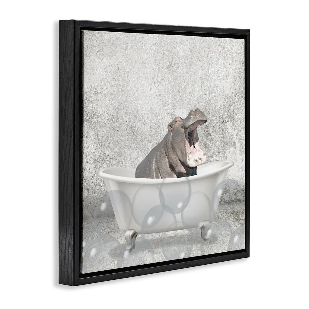 Elevate your home or office to the next level with Stupell Framed Floating Canvas Wall Art. Our premium hand-stretched canvas is mounted securely into a sturdy lightweight frame. The museum-style gap between the wrapped canvas and the box frame gives the illusion of floating artwork. Stupell Wall Art is made in the USA.Features: Dimensions: 18 x 1.7 x 18 Frame, 17 x 1.5 x 17 Canvas ArtFloating Frame Canvas Products are available in sizes 18"x18" and 25"x25". All Floating Frame Canvas Products have a 1.7" Depth.Wall Art is Ready to Hang with Hardware Free Hanging. No Installation required. For Easy Set Up Lean or Layer Artwork on Shelf or Against Wall. Artwork is Permently Fixed into the Frame.Our elevated 1.7" Thick Floating Frame is the perfect complement to our canvas style Wall Art. We use only the highest quality inks in house with industry leading printing solutions. Canvas is hand stretched over a durable wood foundation and then mounted securly into a Modern Box Frame. Made in the USA.Artwork Relates To: Animal, Bathroom, Bathtub, Bubbles, HippoDesign by Kim Allen