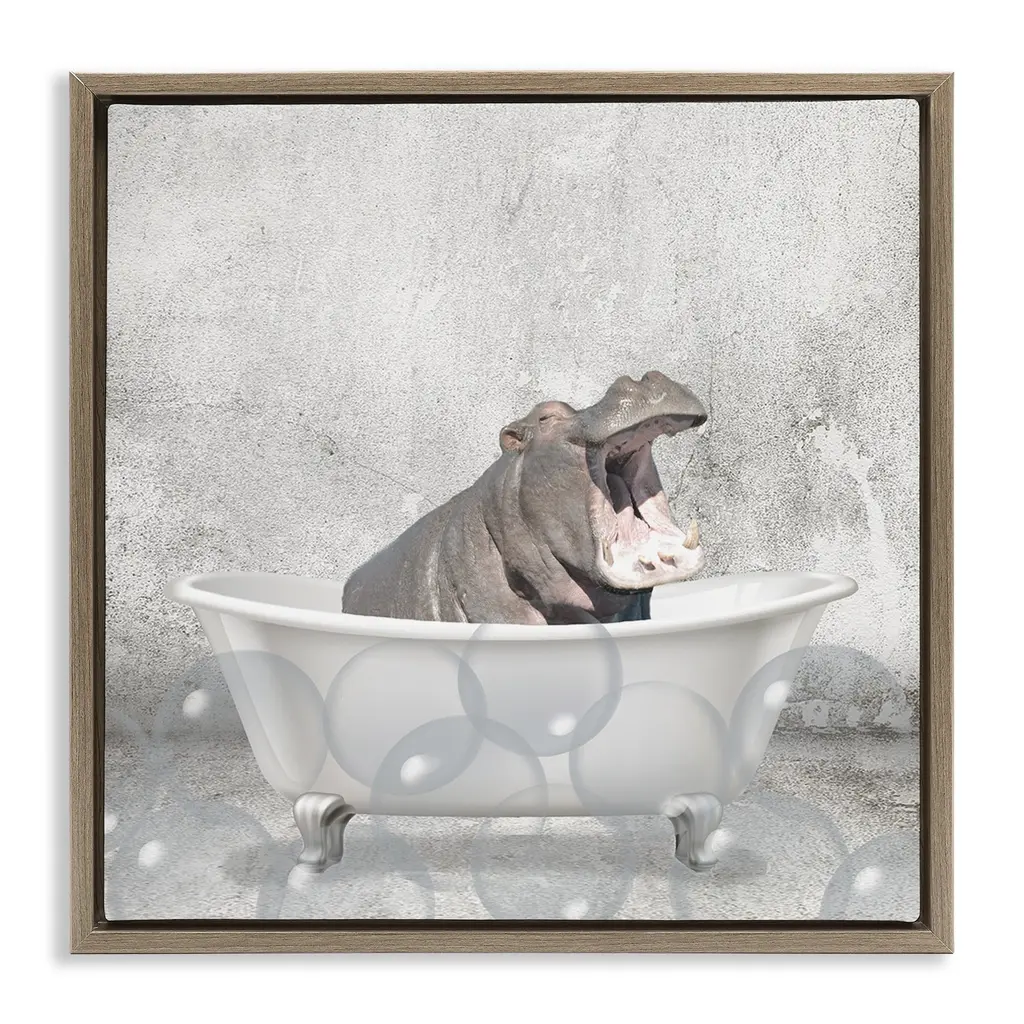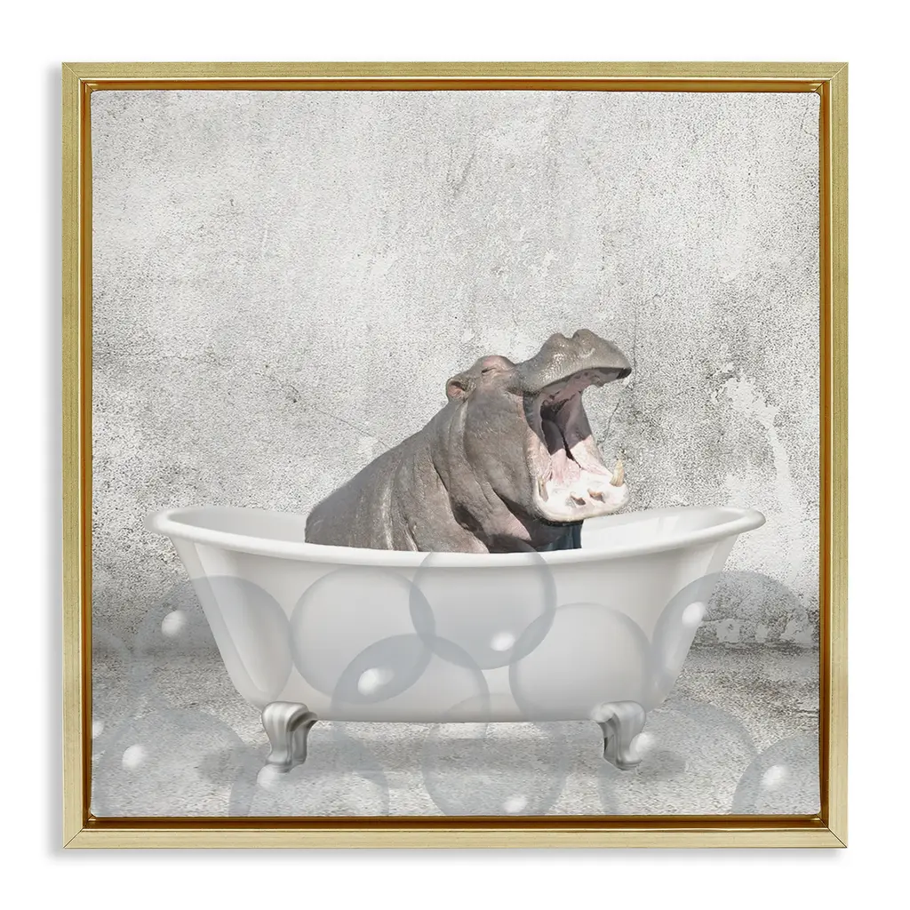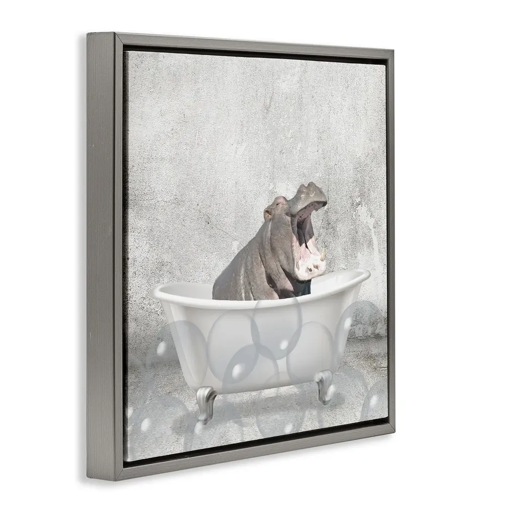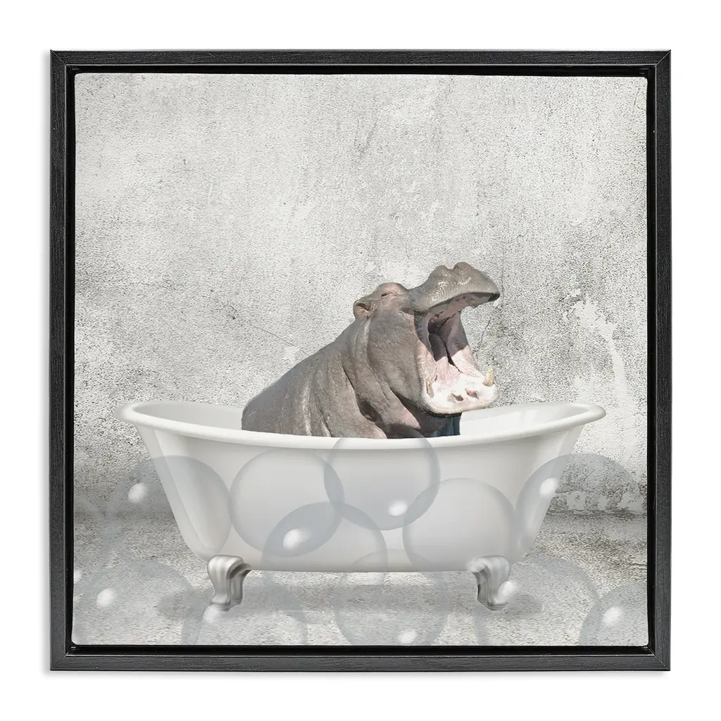 Elevate your home or office to the next level with Stupell Framed Floating Canvas Wall Art. Our premium hand-stretched canvas is mounted securely into a sturdy lightweight frame. The museum-style gap between the wrapped canvas and the box frame gives the illusion of floating artwork. Stupell Wall Art is made in the USA.Features: Dimensions: 18 x 1.7 x 18 Frame, 17 x 1.5 x 17 Canvas ArtFloating Frame Canvas Products are available in sizes 18"x18" and 25"x25". All Floating Frame Canvas Products have a 1.7" Depth.Wall Art is Ready to Hang with Hardware Free Hanging. No Installation required. For Easy Set Up Lean or Layer Artwork on Shelf or Against Wall. Artwork is Permently Fixed into the Frame.Our elevated 1.7" Thick Floating Frame is the perfect complement to our canvas style Wall Art. We use only the highest quality inks in house with industry leading printing solutions. Canvas is hand stretched over a durable wood foundation and then mounted securly into a Modern Box Frame. Made in the USA.Artwork Relates To: Animal, Bathroom, Bathtub, Bubbles, HippoDesign by Kim Allen