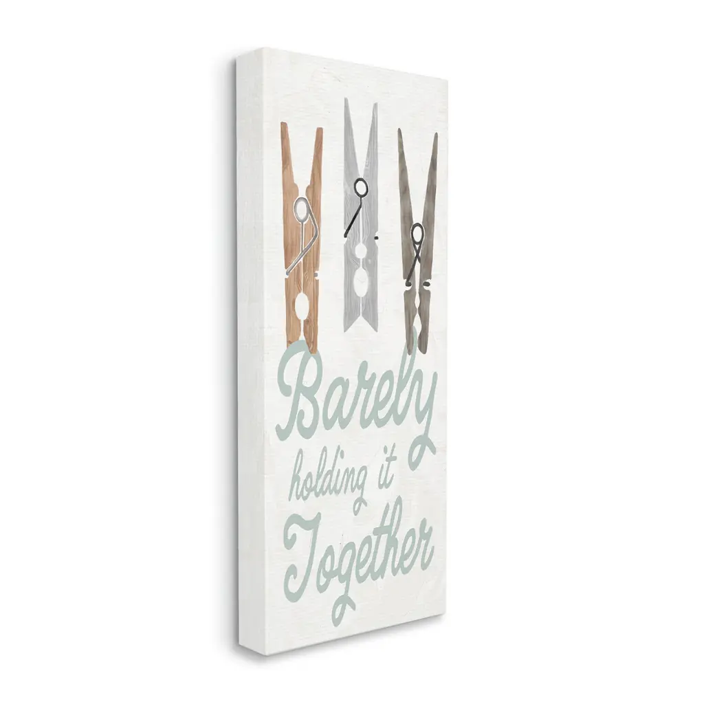 We create our stretched canvas to the highest standards. Using only the highest quality inks and canvas on Mimaki printers, we hand-cut and stretch each piece over a 1.5-inch thick wooden frame for hanging. As a result, the art comes ready to hang on the sturdy ledge with no installation required. Stupell Wall Art is made in the USA.Features: Dimensions: 10 x 1.5 x 24 InchesStretched Canvas Sizes Include Standard: 10 x 1.5 x 24 Large: 13 x 1.5 x 30 X-Large: 17 x 1.5 x 40 Oversized: 20 x 1.5 x 48Wall Art is Ready to Hang with Hardware Free Hanging. No installation required. For Easy Set Up Lean or Layer Artwork on Shelf or Against Wall.Our stretched canvas is created with the highest standards. We use only the highest quality inks and canvas on our in house Mimaki printers, and then hand cut and stretch each piece over a 1.5 inch thick wooden frame for hanging. Made In USA.Artwork Relates To: Phrase, Laundry, Funny, Clothespin, Barely Holding It TogetherDesign by Elizabeth Medley