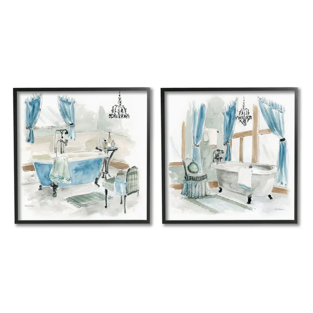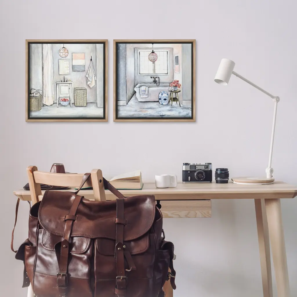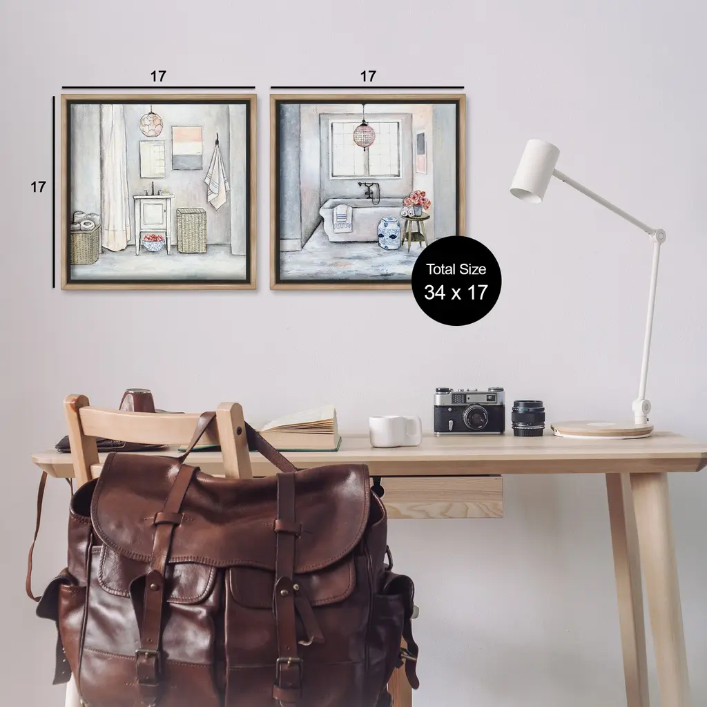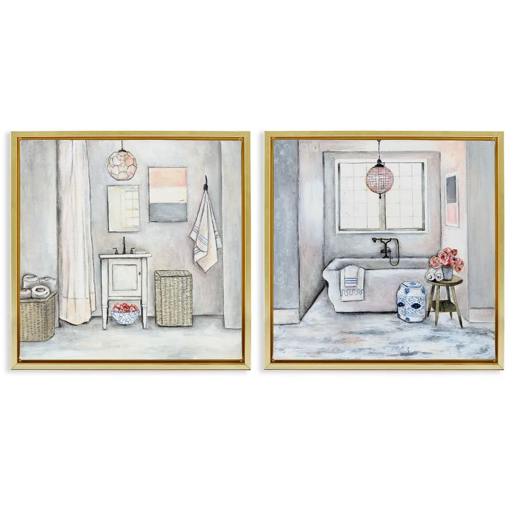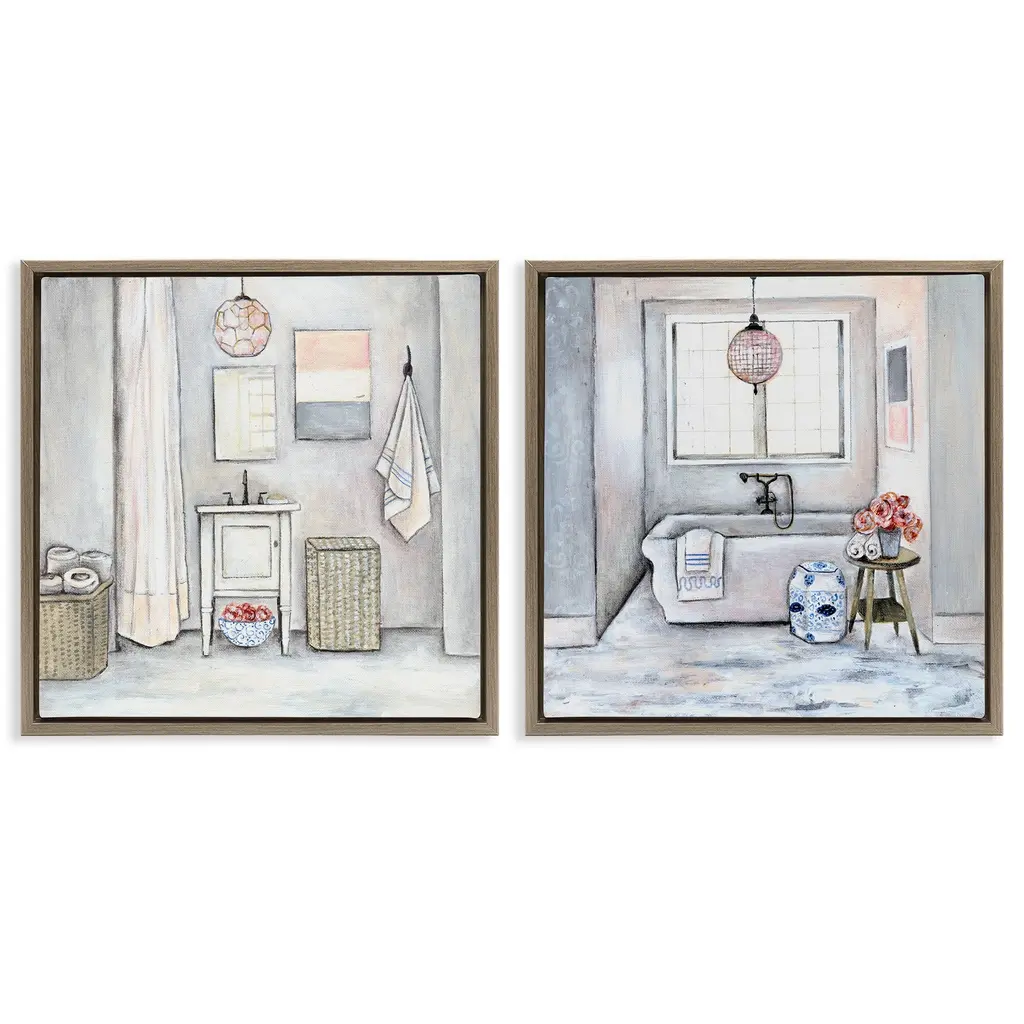 Elevate your home or office to the next level with Stupell Framed Floating Canvas Wall Art. Our premium hand-stretched canvas is mounted securely into a sturdy lightweight frame. The museum-style gap between the wrapped canvas and the box frame gives the illusion of floating artwork. Stupell Wall Art is made in the USA.Features: Dimensions: 2 Piece Set, Each Frame is 18 x 1.7 x 18Two Piece Floating Frame Canvas Products are available as 18"x18" or 25"x25" Panels. All Floating Frame Canvas Products have a 1.7" Depth.Wall Art is Ready to Hang with Hardware Free Hanging. No Installation required. For Easy Set Up Lean or Layer Artwork on Shelf or Against Wall. Artwork is Permently Fixed into the Frame.Our elevated 1.7" Thick Floating Frame is the perfect complement to our canvas style Wall Art. We use only the highest quality inks in house with industry leading printing solutions. Canvas is hand stretched over a durable wood foundation and then mounted securly into a Modern Box Frame. Made in the USA.Artwork Relates To: Traditional, Bathroom, Scenery, Bathtub, Floral, BouquetDesign by R. Rig