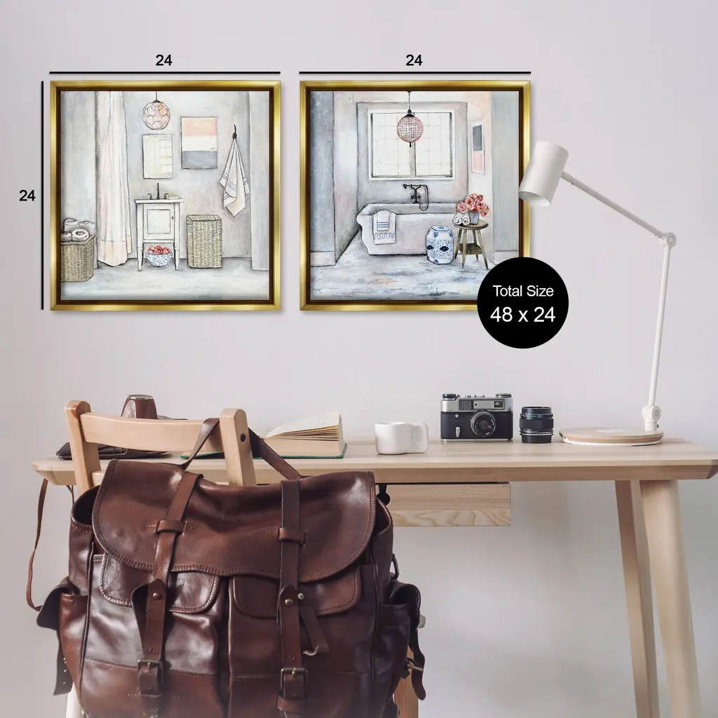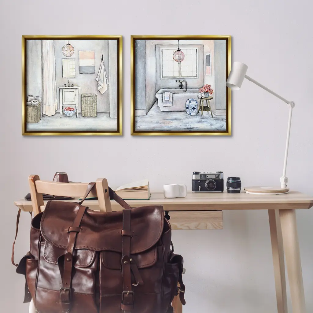 Stupell Bathroom Interior Soft Cottage Design Framed Floater Canvas Wall Art Design By R. Rig (Set Of 2) - 25 X 25 - Gold